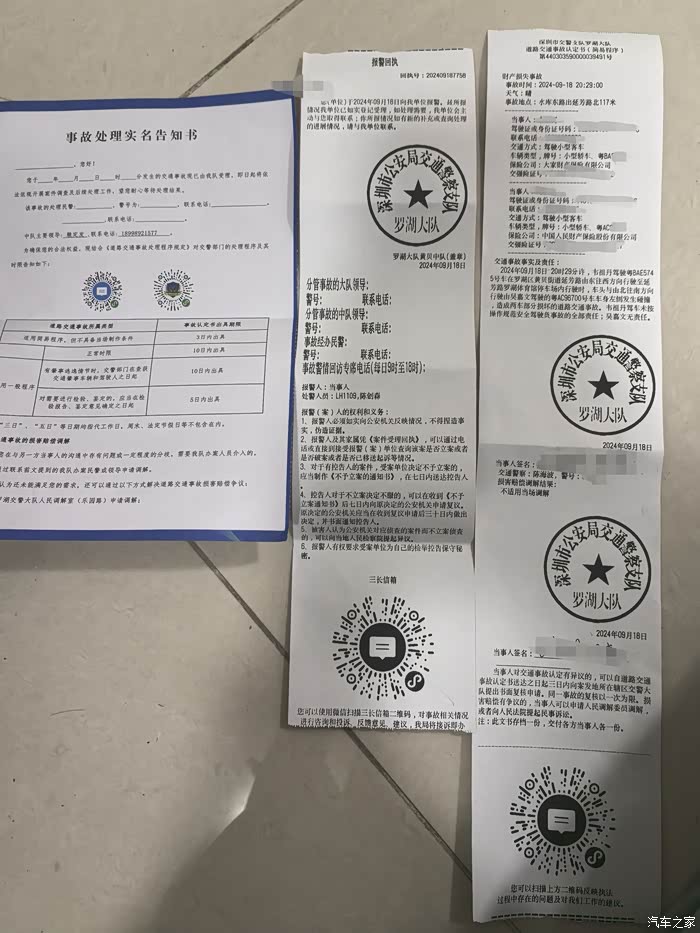 因为对方一开始说有争议,所以交警就需要调取监控,我们的车有自带行车记录仪,而且画面十分清晰,交警看完初步判定是对方全责,但是还需要调取停车场的监控,给中队长判责,所以我们等待。对方车辆的行车记录仪一直调不出来,还磨磨蹭蹭的。现场好多司机都说是他全责,但是他死活不认~最后调取完停车场监控之后,中队长也是判定对方全责,然后现场交警出具责任判定书,双方签字以后就离开现场了,还好车还能开。不然还要拖车回佛山呢~