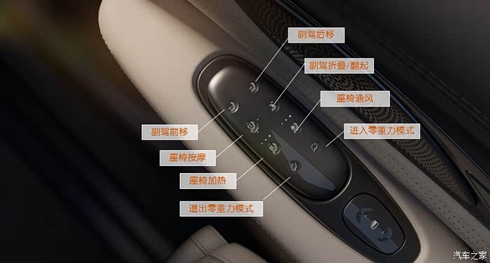 零重力座椅右侧门内有多功能触控面板,可开启加热、通风、按摩等舒适性功能;同时还能控制副驾座椅前后移动、全平翻折,进入或退出零重力模式。但须注意,使用部分功能时不要误伤副驾乘客。