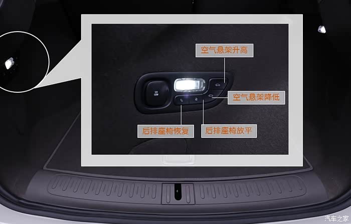 如下图圈出位置所示,后备箱左侧装有多功能面板。可以控制后排座椅一键放平或者恢复至原位,也可以调节后轴空气悬架升降,方便存取物