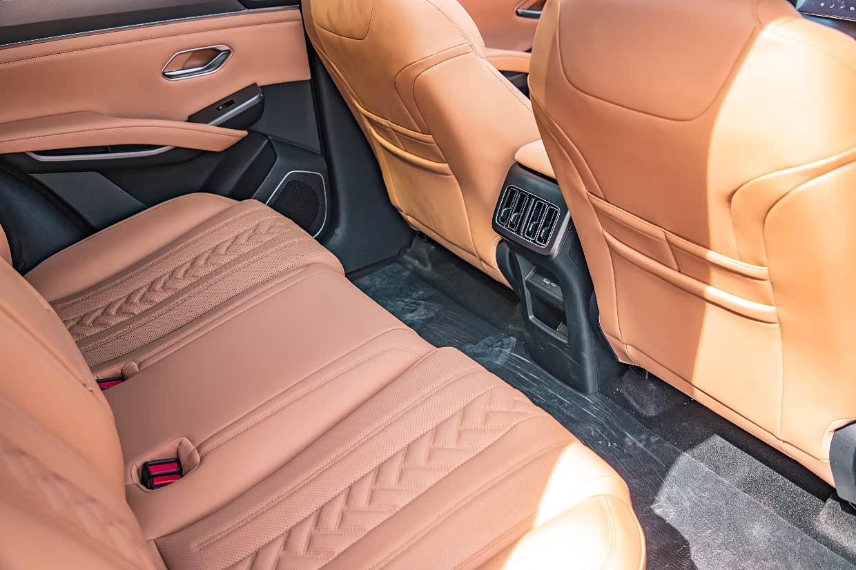 作为家用车,后排空间也很重要。宋L DM-i智驾版的后排空间宽敞,足以容纳三名成年人,并且腿部和头部空间也很充裕,不会感到拥挤。座椅材质柔软,能够提供良好的支撑性和舒适度,此外,后排座椅还可以按比例放倒,进一步扩展了储物空间,满足家庭出行的多样化需求。