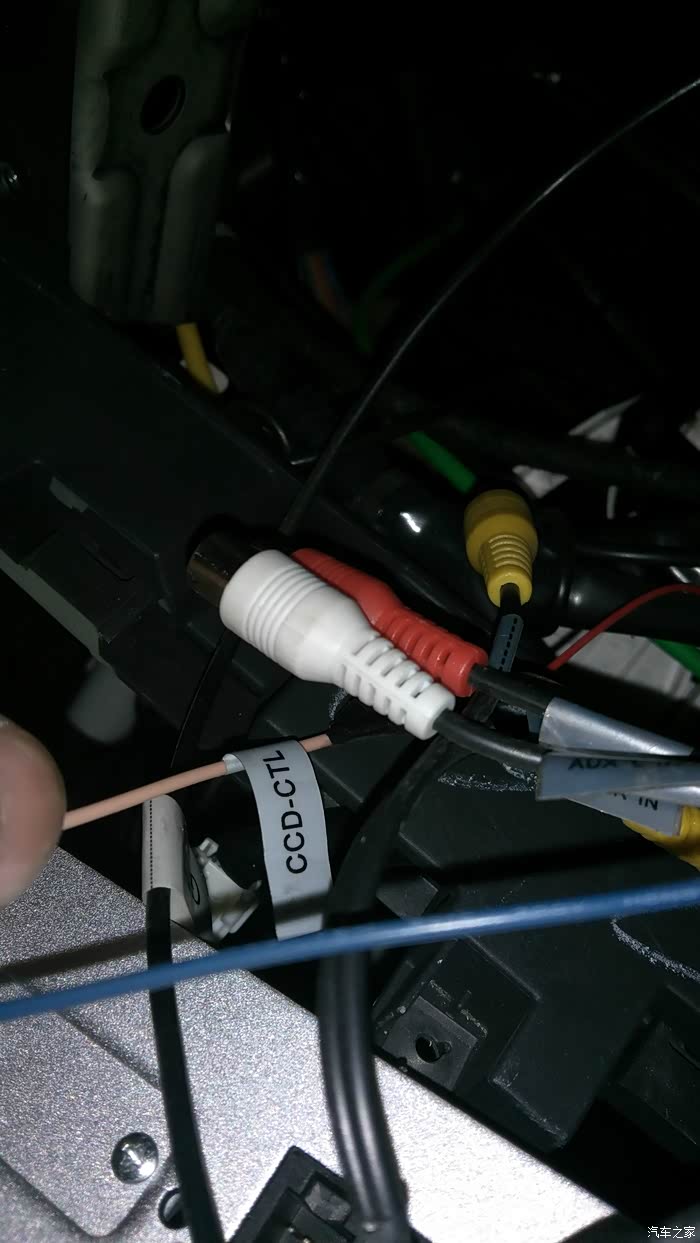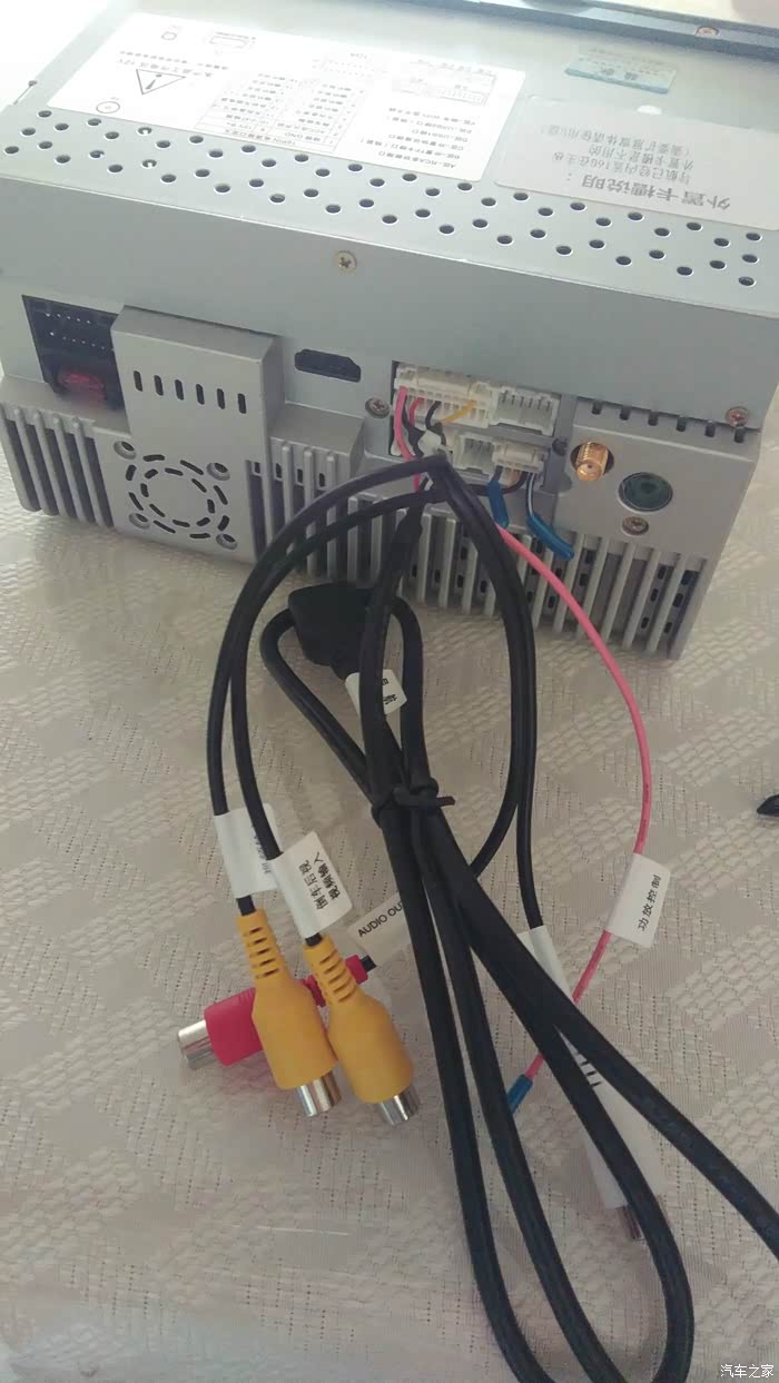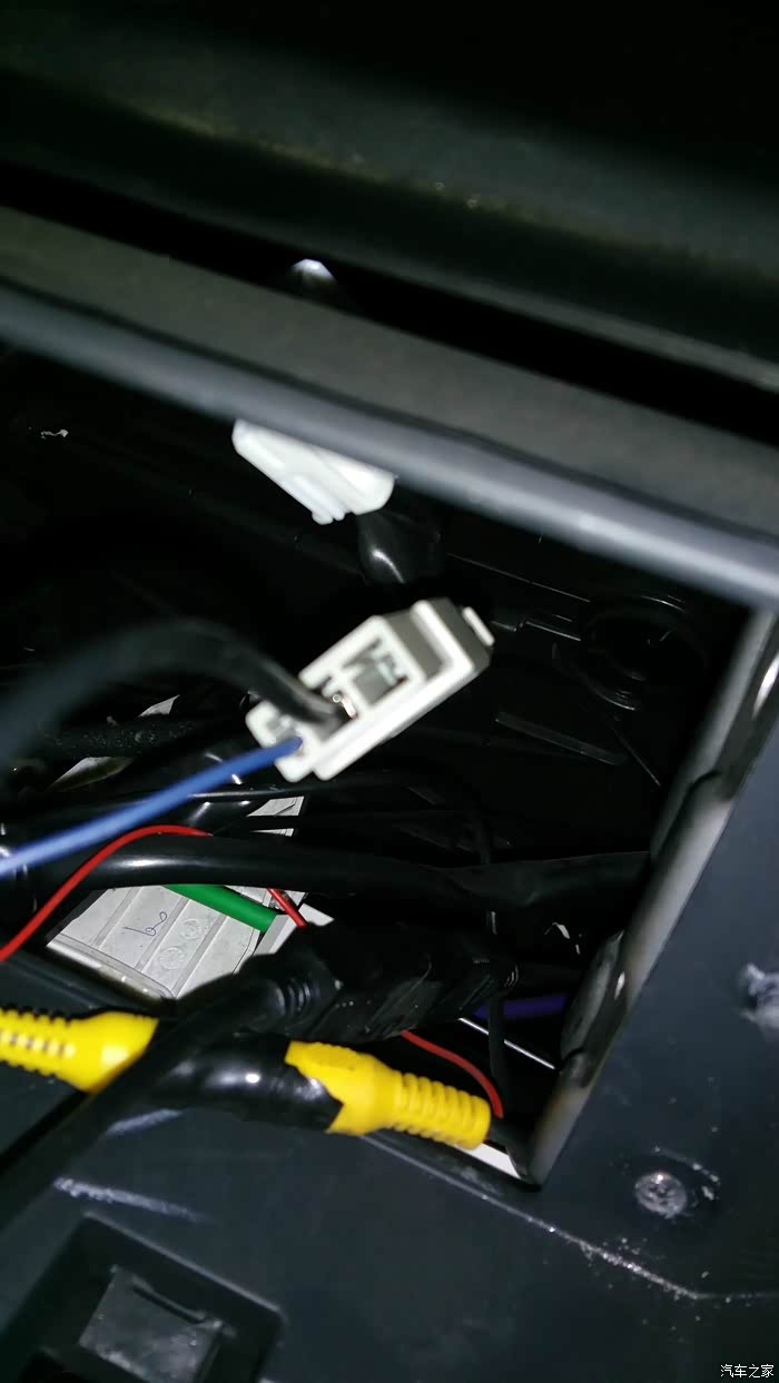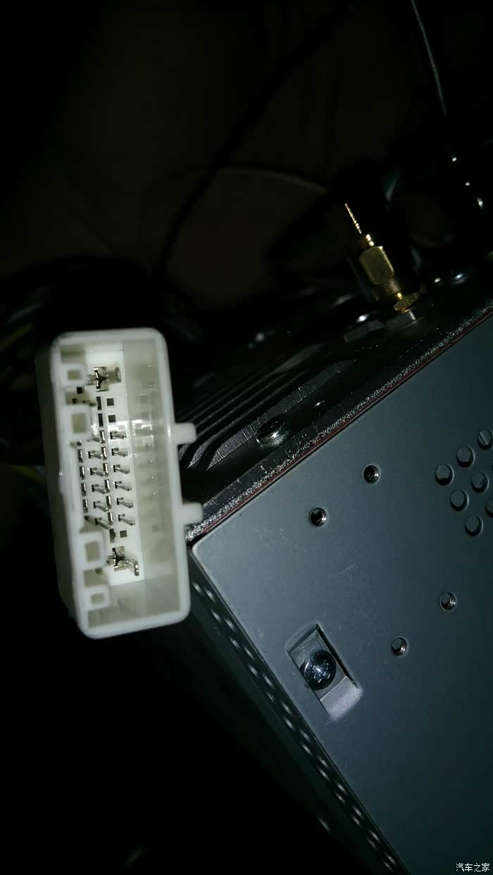 第二步是把原来的车机拆下来,固定车机的支架上有四颗螺丝,然后就是松脱电源线的白色插头和灰色的收音机插头,公头是连接到车上的,母头是车机上的,因为我之前的导航设备里GPS,倒车影像线都是已经安装好了的,这些线全部是通用的,不用费多大事,拔掉倒车视频头,松开倒车检测线,拧掉GPS线和USB延长线,DVD导航就全部离开中控了;