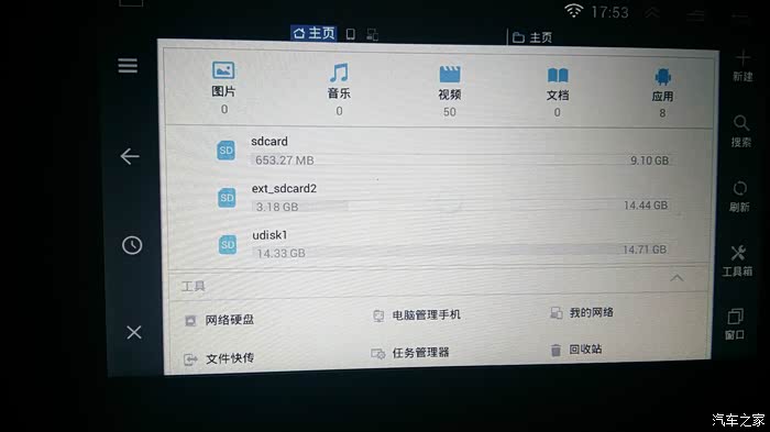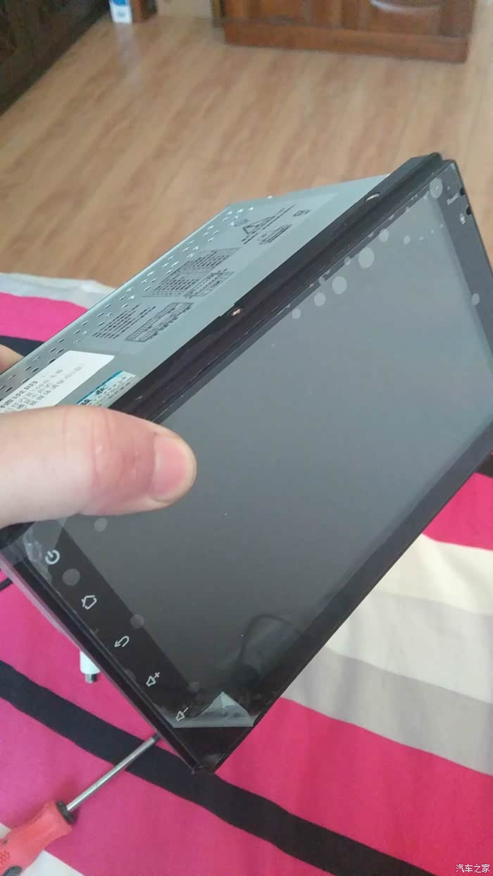 动手开拆,主机不用全拆开,只需要把电路板两侧的确颗螺丝拧下来就OK了,再把后面三颗螺丝和上面两颗螺丝拧掉,最后拆电路板上的5颗螺丝,电路板就松脱开来,看到后面的卡槽了,由于这部分打开时要异常小心,没有拍照,所以大家可以发挥想象了。。注意,拧电路板上的螺丝一定要小心,螺丝都很紧,我就拧滑了一颗,最后用钳子把它一点一点抠下来的!下面装上卡,复原,接电调试,第一次因为卡没有格式化,我还在里面装了不少歌曲和软件,结果悲剧了,机器不开机,黑屏,我以为是系统ROM不支持板载卡槽,跟店铺的技术人员好顿研究,又要来了最新版本的系统ROM,准备升级。。还没等我升级,峰回路转,我尝试把卡取出来格式化一番,第二次拆装放回去,机器终于正常了,听歌,导航,安装DSA,安装电视家APP,安装Torque车况大师,一切OK!