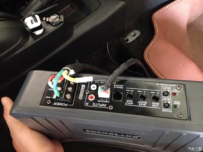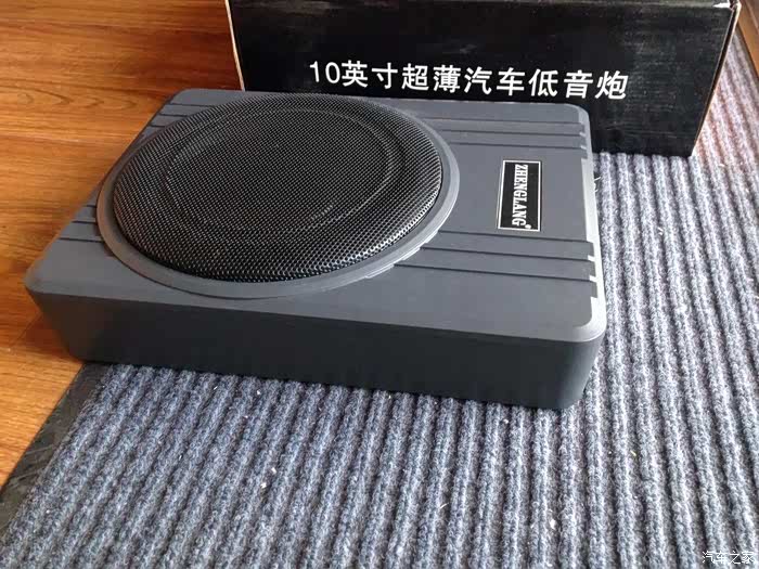 前文讲到前排喇叭无箱体加上口径过小导致低音太弱,均衡器调大低音后排又会受不了,于是就有了这个超薄低音炮。本着追求性价比的原则,T宝买的正浪10寸超薄低音炮,原价¥318,我只要裸机不要配件¥300元。其实这类便宜的低音炮很多牌子都是用一样的模具,简单的说就是贴牌产品,然后做个包装就可以拿来卖了。铝合金机身,共10斤重,单手拿一会儿都嫌累。