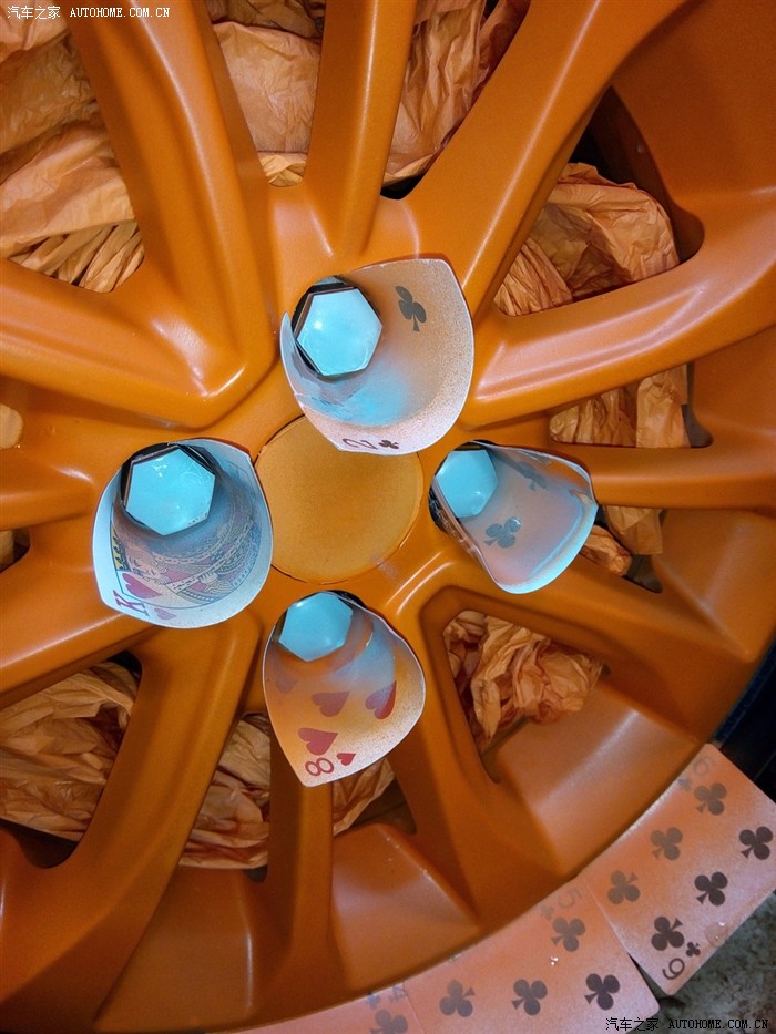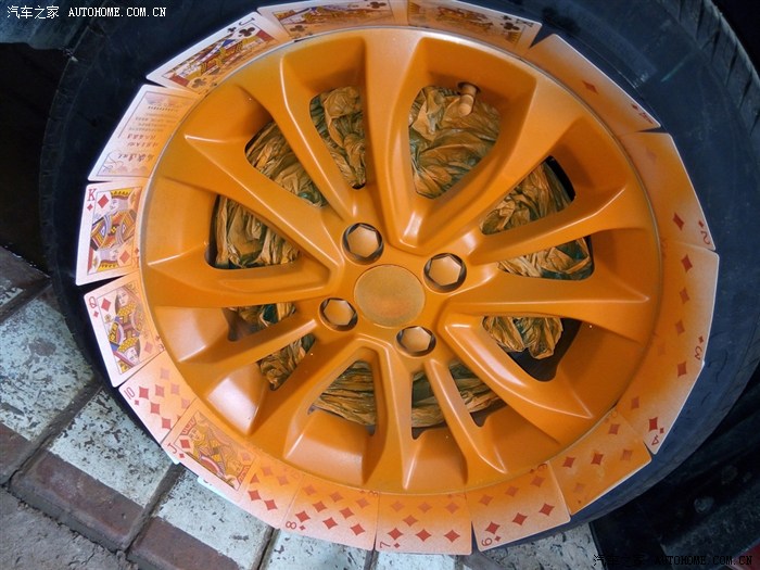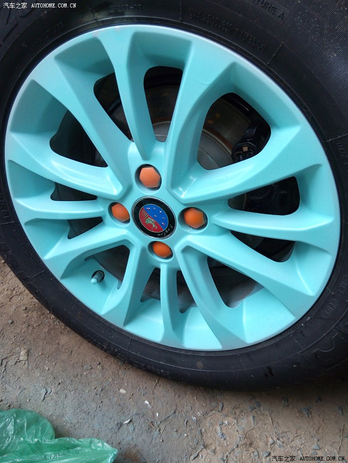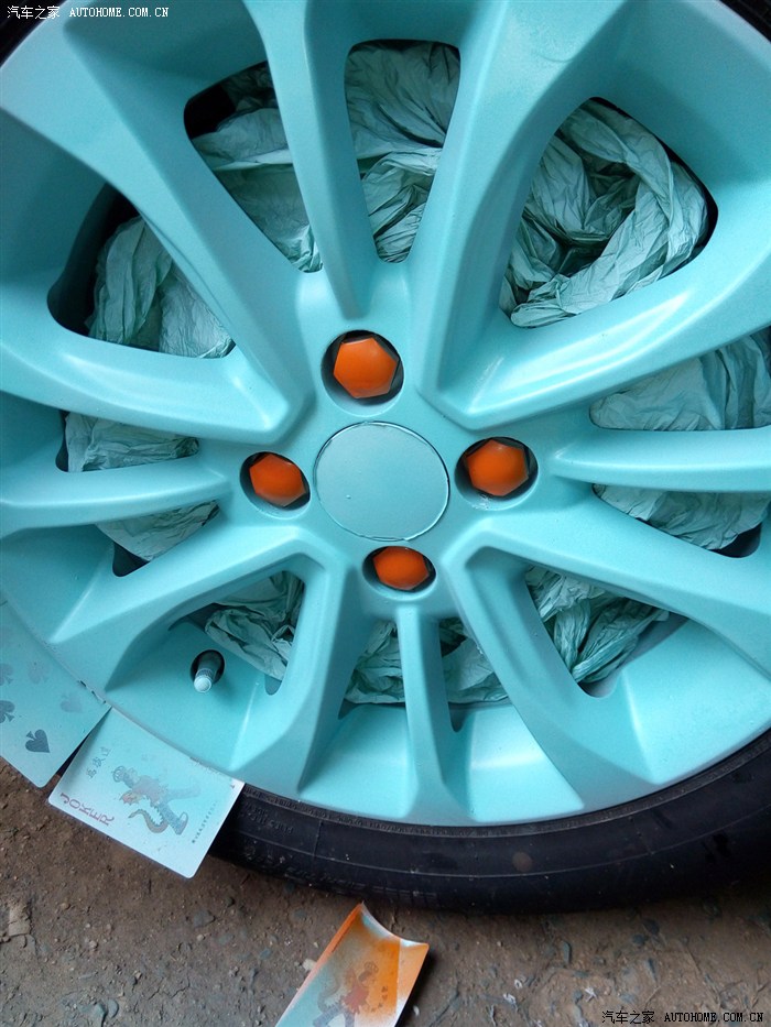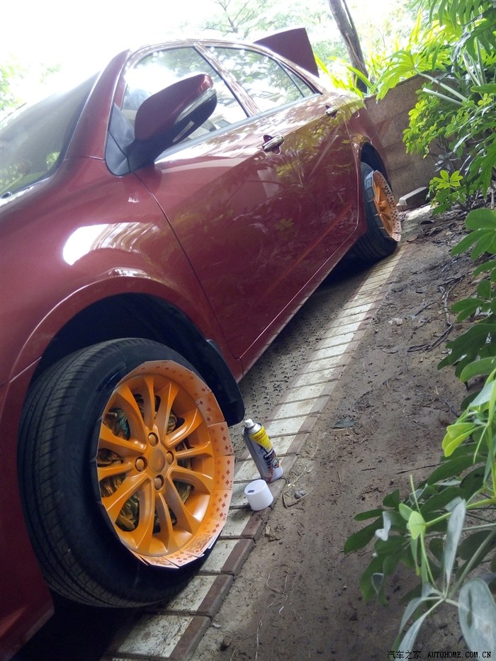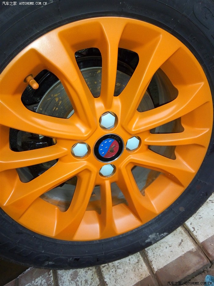 3、之前四个轮毂不同色,,现在四个都喷成了亚光橙,看起来舒服多了。看来时间是检验真理的唯一标准啊。