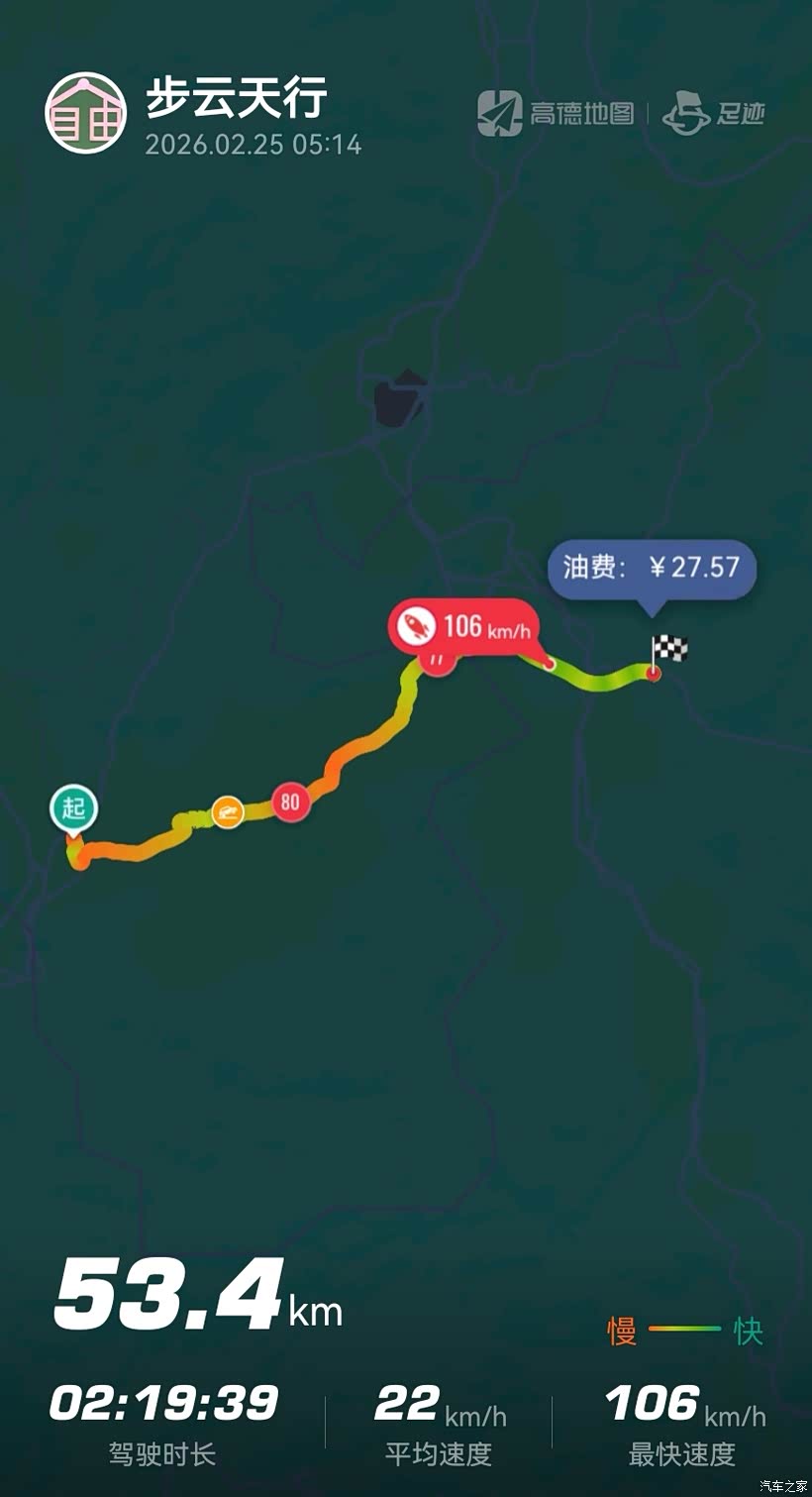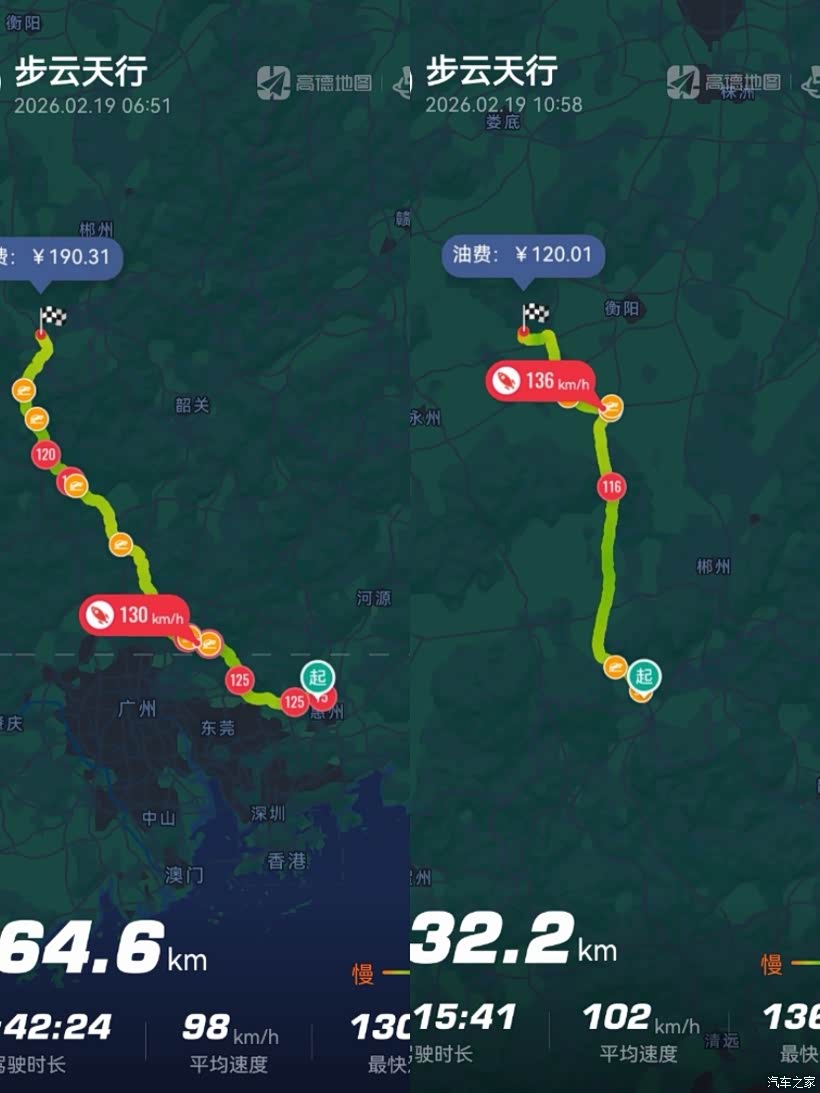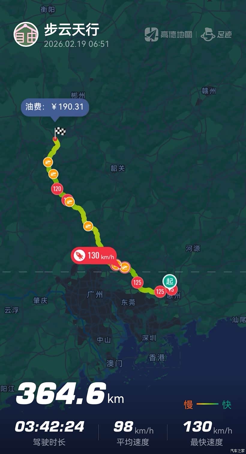 💖一、去程路线(惠州 → 祁东):广惠高速 → 广连高速 → 许广高速,单程约 646公里。2月19日,满油满电出发,途中没有充电,总续航1100km左右。借着回老家过年的难得机会,顺便测试了续航能力。自从系统升级1.3.1以后,原先仪表屏上总续航显示,这次不知道为什么没有了,使用起来有点不是很方便,这方面需要OTA改进,但是手机APP可以显示。