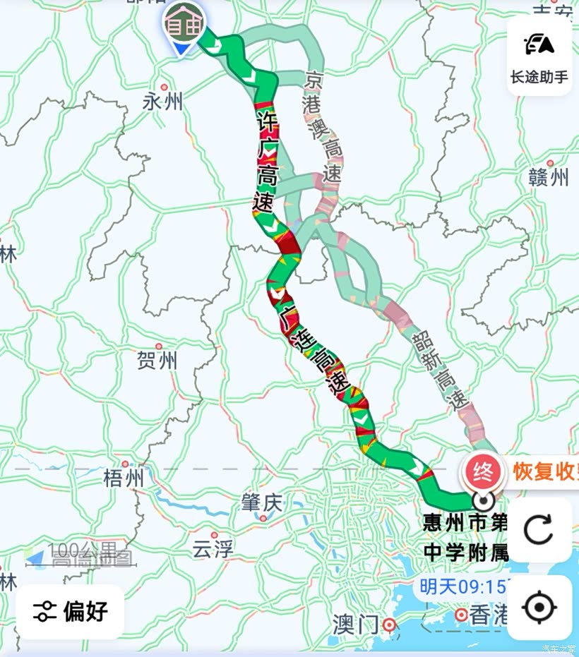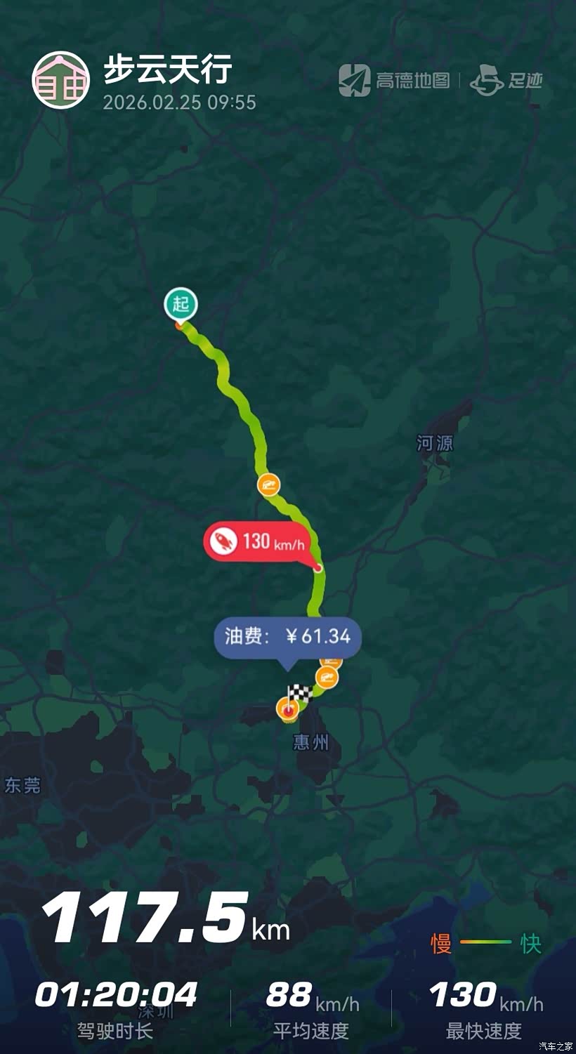 💖二、回程路线(衡阳 → 惠州):许广高速 → 乐广高速 → 韶惠高速。2月25日,初九返程,回程距离相近,满油满电满载,因为回家后备箱塞的满满的“妈妈的爱”,凌晨3点出发,中午11点到,用了8个小时。头天晚上,我早早就睡了,返程回家比较兴奋,晚上2:30起夜的时候,用手机查了一下路况,全程路况还是比较顺畅的,偶尔几个堵点有一点点飘红,但是可以接受。我本着“早出发半个小时,早到2个小时”的原则,我一早就把全家人叫醒了,出发时间大约是凌晨3点。