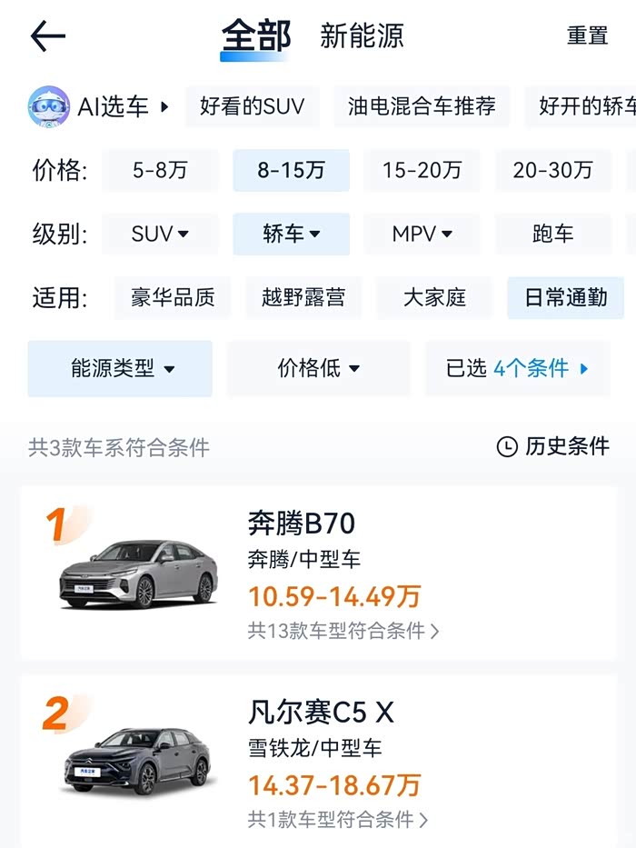如今的汽车市场呈现出千帆竞渡、百舸争流之态,各个汽车品牌不断推陈出新,车型款式更是层出不穷,让人眼花缭乱、目不暇接。在如此纷繁复杂的市场环境下,若想买到心仪的好车,明确自己的购车预算至关重要。一旦确定了清晰的预算区间,在选车时便能事半功倍,不会在像同无头苍蝇一般毫无头绪、盲目乱撞。例如,10万级的购车预算范围很大,可供选择的车型款式也很多。这时,我们就可以借助一些大型汽车平台,按照预算范围、性价要求、功能配置进行初级筛选,进而圈定出大致的购车范围。