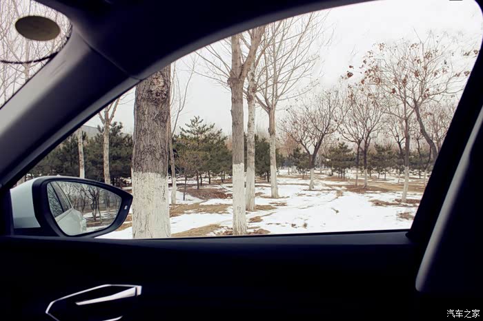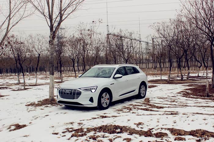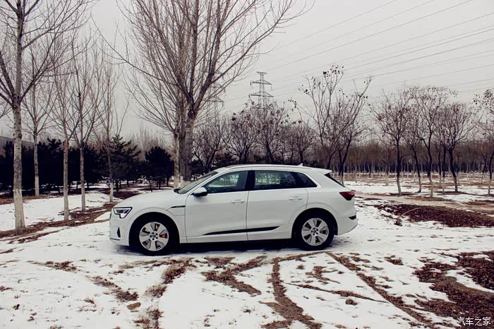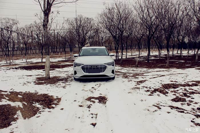 为了感受一下不同路段下e-tron的行驶感受,我特意跑到郊区找了一片雪还没有完全化开的林子,试试e-tron在这种湿滑越野路面下的表现如何。