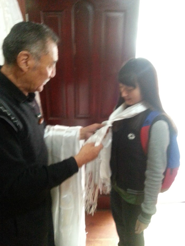 早晨继续赶路,在转山的演员,一个老爷爷的店里吃的早餐,还给我们每个人和车都献上了哈达!拿红领巾的时候都没见过她那么认真严肃·····