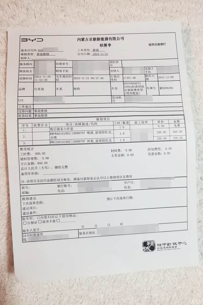 【维修价格】这次到店维修喷漆保险杠,喷漆费用600元,保险杠拆卸工时费200元,一共费用是800元,由于是走的对方的保险,所以这次我没有花钱。相比于外面维修小店全杠喷漆只要三四百元来说,4S店维修费用确实高一些,不过大家还是比较信任4S店的售后水平,另外报保险也肯定是在4S店进行维修,这次维修用了3天。定损员告知,在2年内漆面出现啥问题,都可以到店免费给处理,还是不错的。