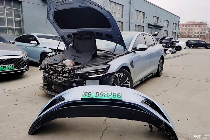 【诊断过程】定损员需要售后维修技师将前保险杠全部拆下来后,判断左前大灯的灯卡子是否有断裂,如果有的话就需要更换新大灯了。我问了一下定损员,一颗海豹的前大灯居然两千多块钱,真不便宜!即便是需要更换,也是对方保险买单。在拆解海豹前保险杠的过程中,给我留下的印象挺深刻的,轮舱内用十几道螺丝固定,表现十分坚固。另外海豹的前防撞钢梁材质为轻量化铝合金,面积大、厚度足,吸能盒也十分粗壮、长度充足,表现非常扎实,给好评。