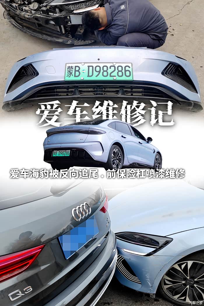 【问题描述】:我们单位停车场非常拥挤,每天上班想要找到一个合适的车位,就要提前二十几分钟从家出发,到停车场能够尽早“抢占有利位置”。不仅如此,还要眼观六路躲避新手司机的各种莽撞行车,即便是这样,我的爱车海豹还是被前面的一台正在倒车的奥迪Q反向追尾“亲”上了,我按喇叭已经是长鸣了,但前车依旧无动于衷的往后倒车,造成了这次碰撞事故的发生。奥迪车尾保险杠和我的海豹前保险杠左前侧分别受了轻伤,对方全责报了保险,都需要喷漆处理。