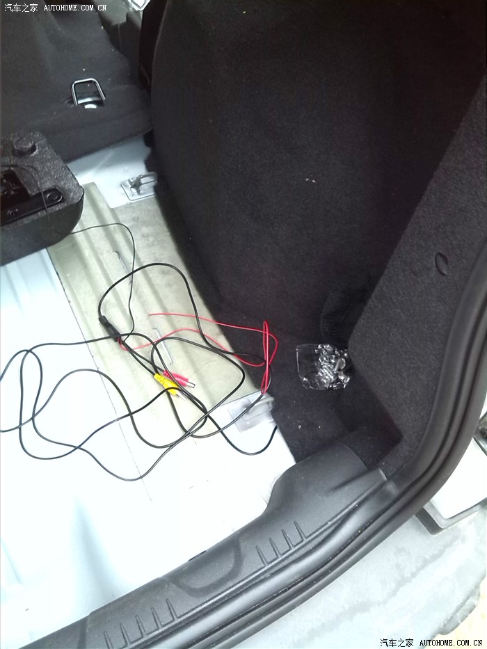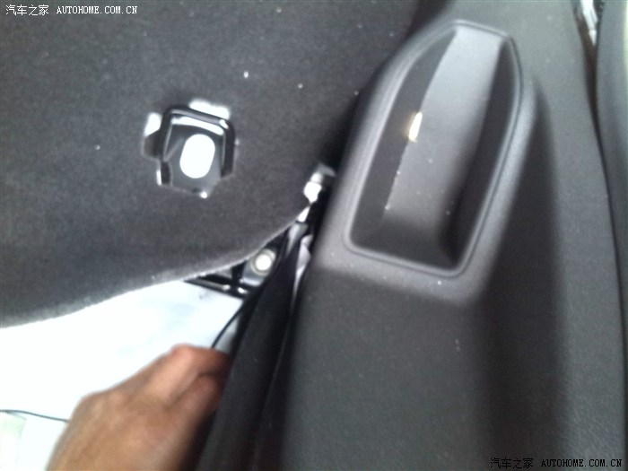 然后要把后备箱右后角绑灭火器那里掰开,看到倒车灯线下去的那个黑色胶圈,把胶圈扣出来,把倒车后视线全部放下去。