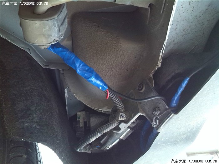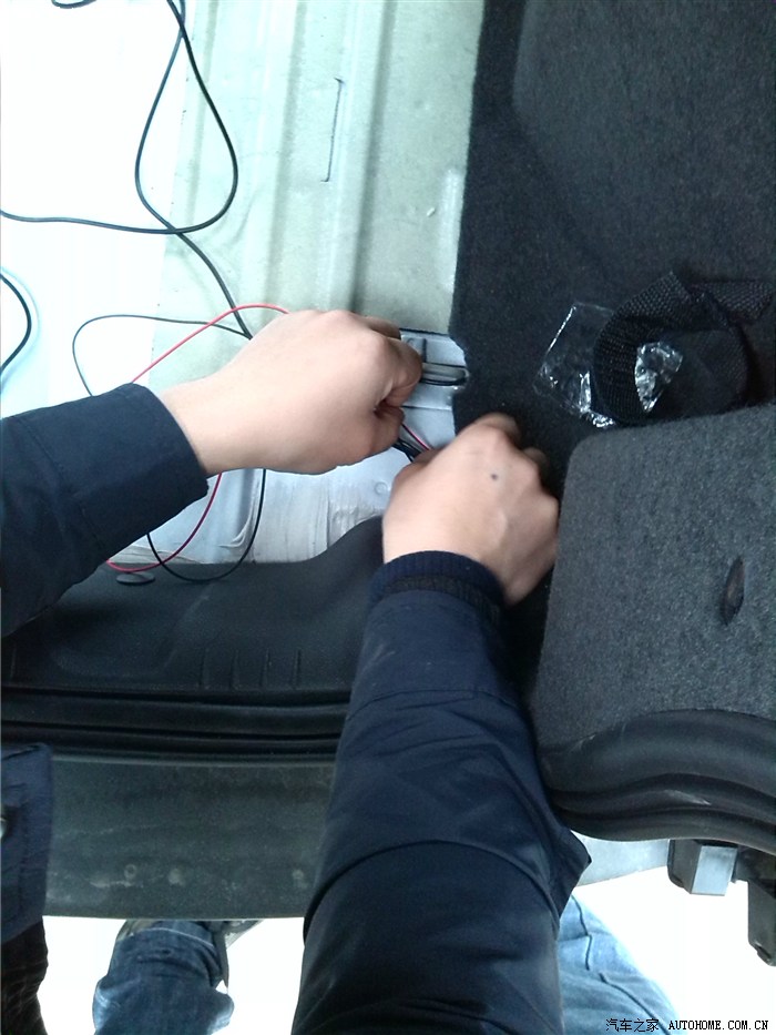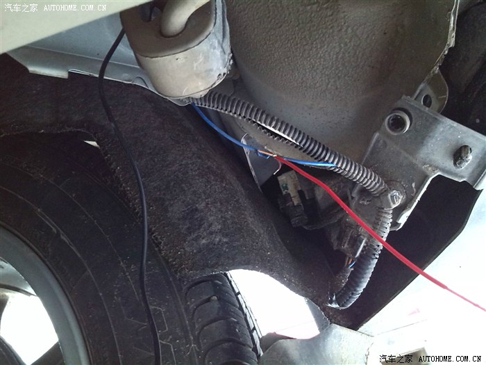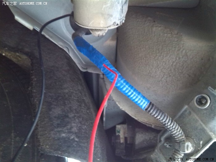 然后把摄像头安好,躺下把倒车灯线蓝色的挑出来,打火机烧开一点,把从前面一直布过来的那根倒车后视线上面的红色细线接上去,先勾上就可以,待试验成功后再包胶带。