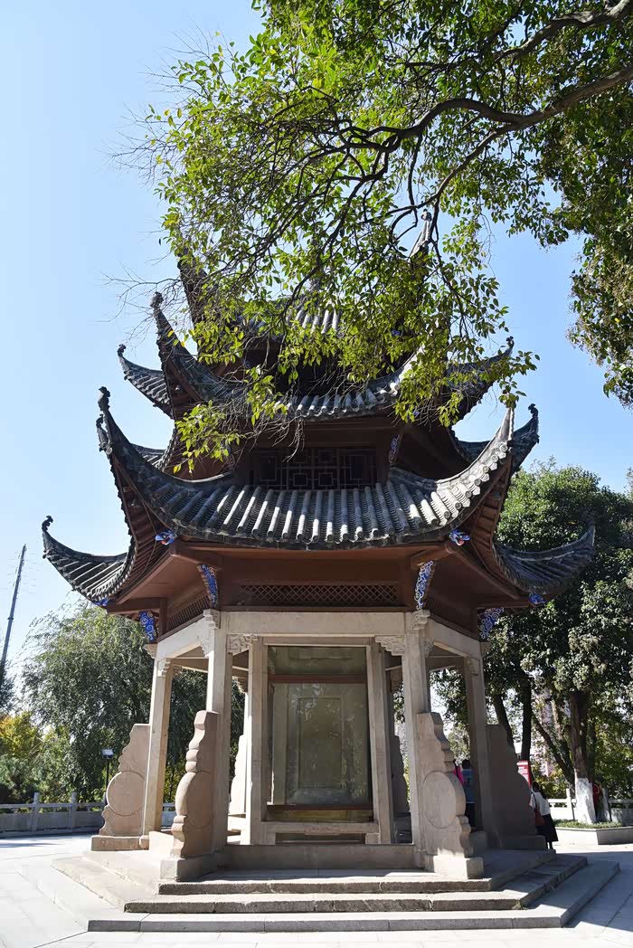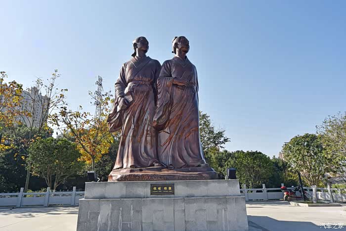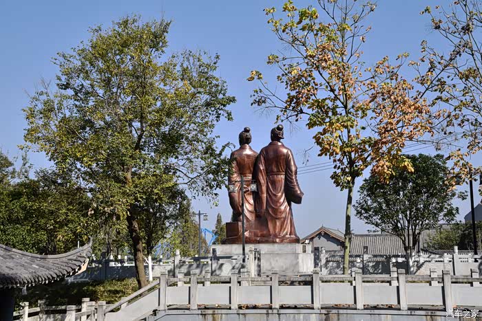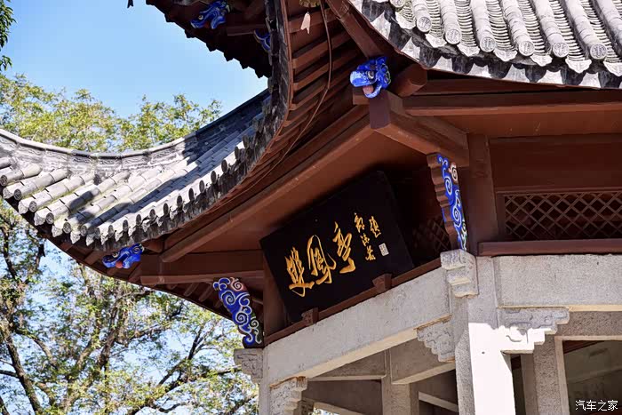 二程兄弟像身后是双凤亭公园。传说程母侯氏梦中遇到双凤投怀,后来相继生下他们兄弟二人,果然为人中龙凤。双凤亭最初在县城内,名为“清远亭”,建于北宋末年,南宋时改名“双凤亭”。明天顺七年(1463年)复建于鲁台山麓二程祠内。清康熙五年(1666年)移至现址,道光二十三年(1843年)被大风刮倒,四年后重建。双凤亭为六角三重攒尖顶式古亭,坐东朝西,木石结构,亭高10米,底边长3.3米,檐下施斗拱,重檐三层,六角攒顶,青瓦朱檐,翼角飞展。正面“双凤亭”匾额为郭沫若题书。亭中立着石砌的方形碑阁,隔着玻璃可以看到工整的字迹,记录了建亭的史实。