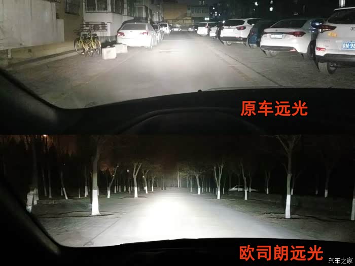 原车远光与安装欧司朗氙气大灯套装远光对比