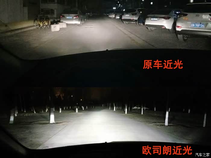 原车近光与安装欧司朗氙气大灯套装近光对比