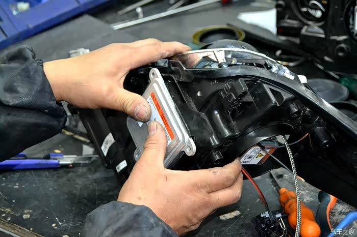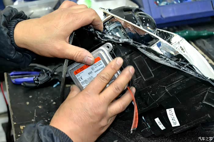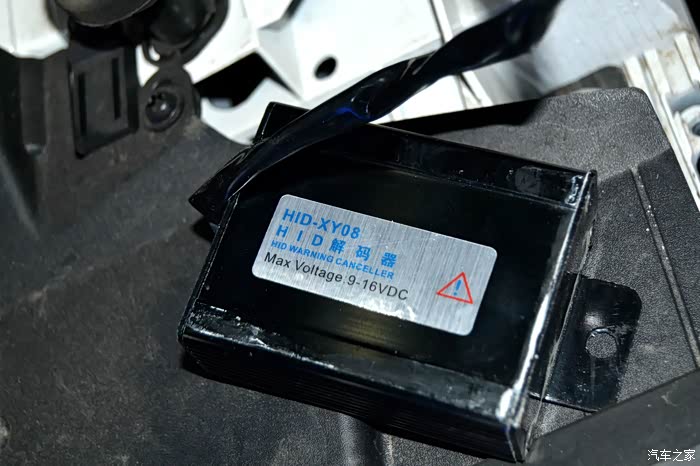 接下来准备安装氙气灯的安定器,安定器的作用主要是在刚开启氙气灯电源的一瞬间,安定器将车上的12V电压瞬间升压到23000V,利用此高强度的电压激活HID灯泡在两极之间产生发出强光,使灯泡达到高亮度照明。