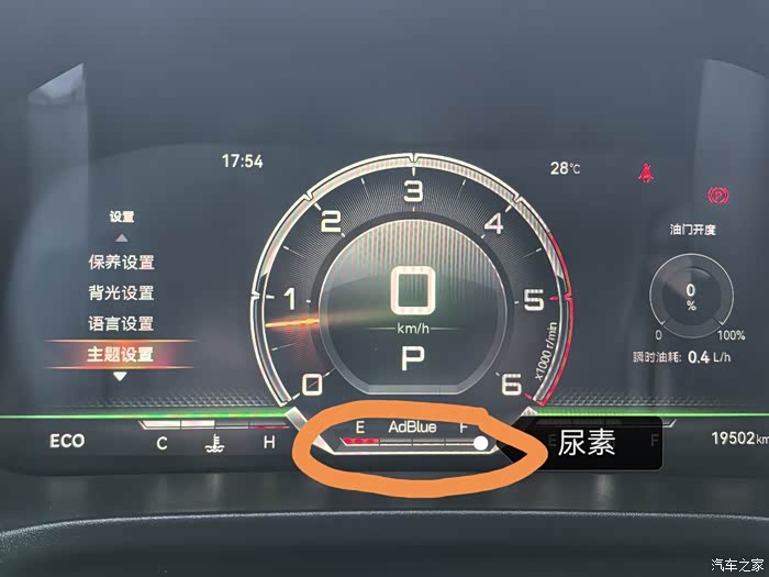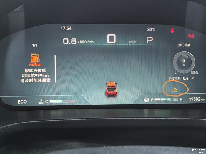 6-尿素余量显示。只在显示屏越野模式下最下面有四格显示,而日常行驶模式下面只有尿素续航低于1000公里是有一个故障提示和一个橘黄色小标在闪烁,有时候这个还是不太方便,出远门之前还要单独切换模式看一下尿素剩余,这个信息感觉可以在日常行驶页面显示一下。