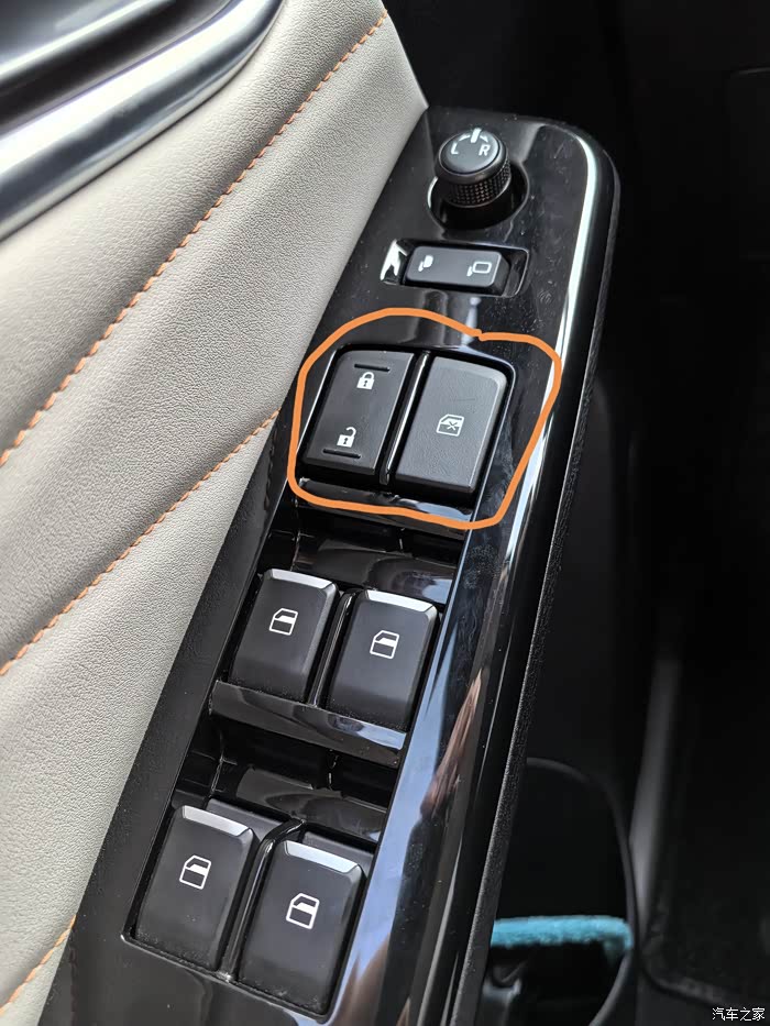2﹣图片这个圈圈里面锁和解锁车门,窗户的按键是没有背光灯的,一开始我以为不会这样设计吧,能不能是我的车子忘记装了,后来厂家调研的时候听其他车友说他们车子也是这样