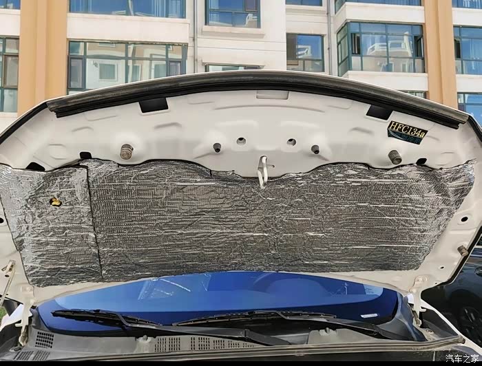 我这车年头长了,这个原车带的隔音胶条部分都开始老化,尤其是在高速上风噪贴特别严重。我从网上淘了一块隔音棉,装在这个发动机舱盖上。使用效果挺好。这个材料我选的隔热防自燃的毕竟安全是第一位。