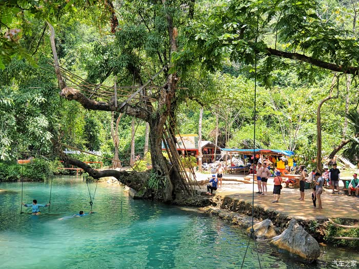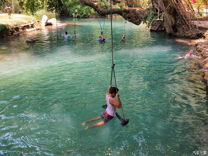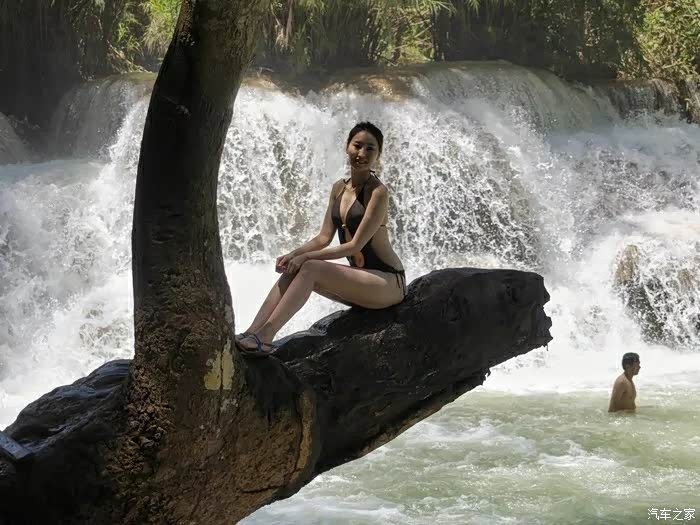与老挝的美女在水中玩秋千,可是坐着三个人加上豆瓣在我背上动来动去,怎么都平衡不了。没玩多久,就听到豆瓣妈在岸边着急的喊:玩得差不多了,水冷,快带儿子回来。水比想象中还冰凉,而且这里树林茂密晒不到太阳,豆瓣在水中泡了一会也吵着要上水。