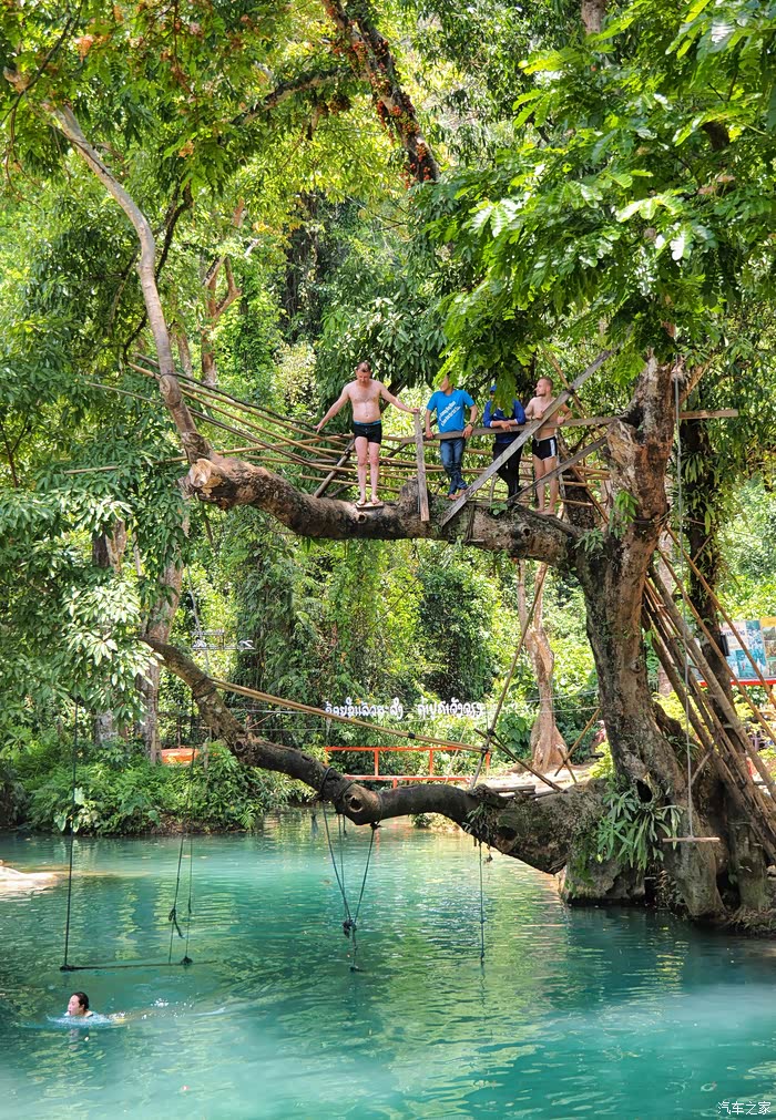 原来这里是一个跳水的地方。分两个高度,看到就让人脚软,别说跳,让我爬上去都不敢。这可比我们在琅勃拉邦光西瀑布爬上去摆拍的地方高多了。你们敢往下跳吗?