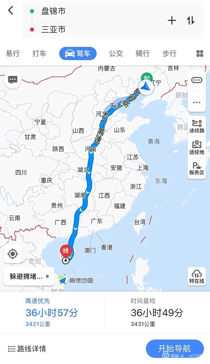 2018年2月9日晚7点出发。盘锦到三亚自驾游,3421公里。