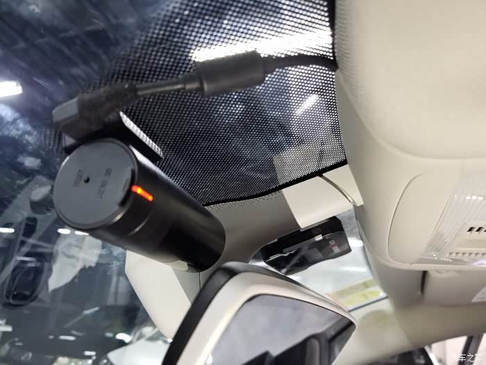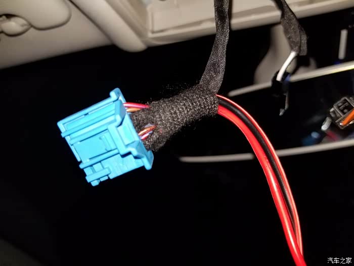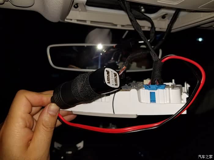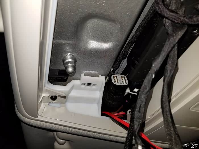 最后就是将USB导线一头插入USB取电头,一头从阅读灯框架前面与顶棚之间穿出连接记录仪,调整好导线长度后将顶配框架固定,恢复上面拆卸的阅读灯面板及后视镜支架盖板等。
