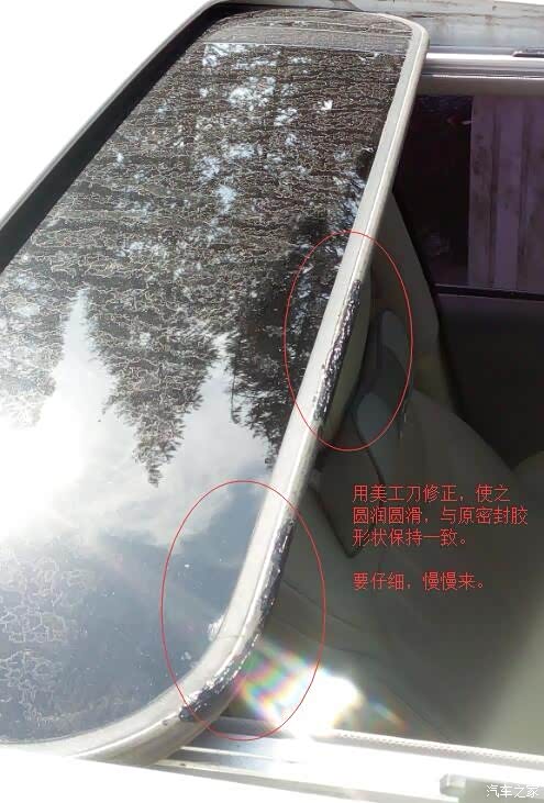 1、选一个晴朗的上午,天窗半开,擦干净天窗四周胶条。用胶枪将耐候密封胶破损处涂满,手工操作难免凹凸不平,没关系。