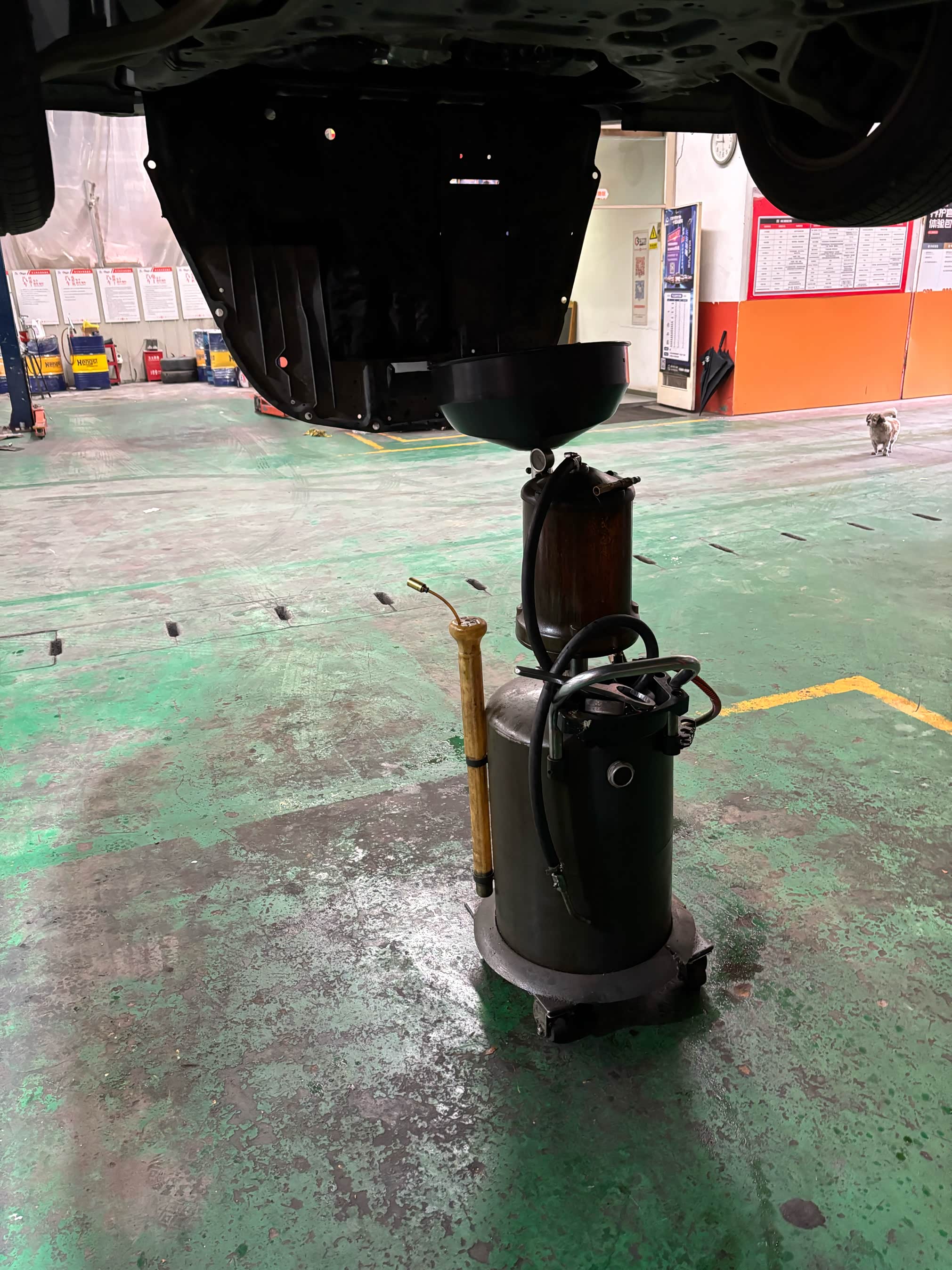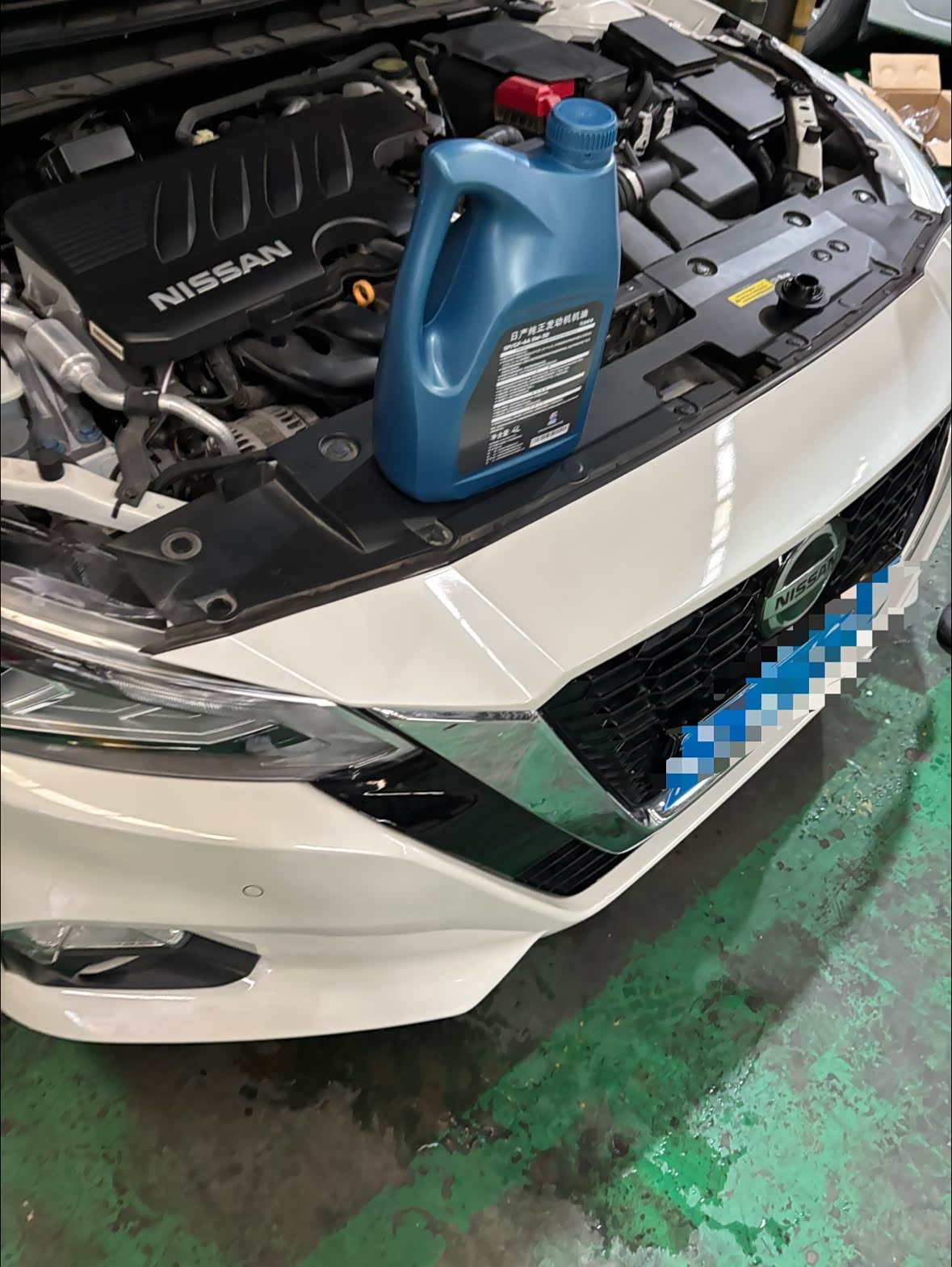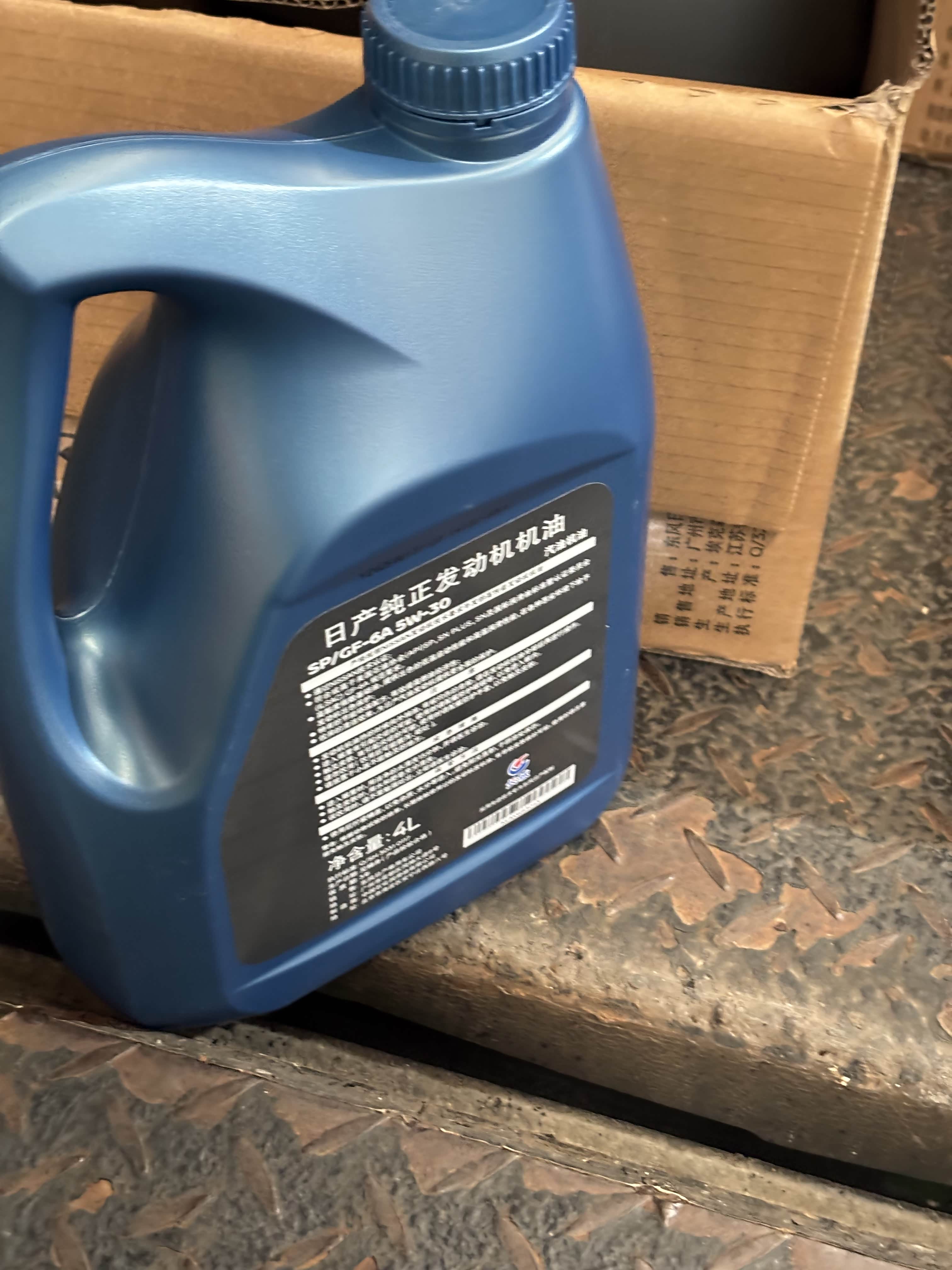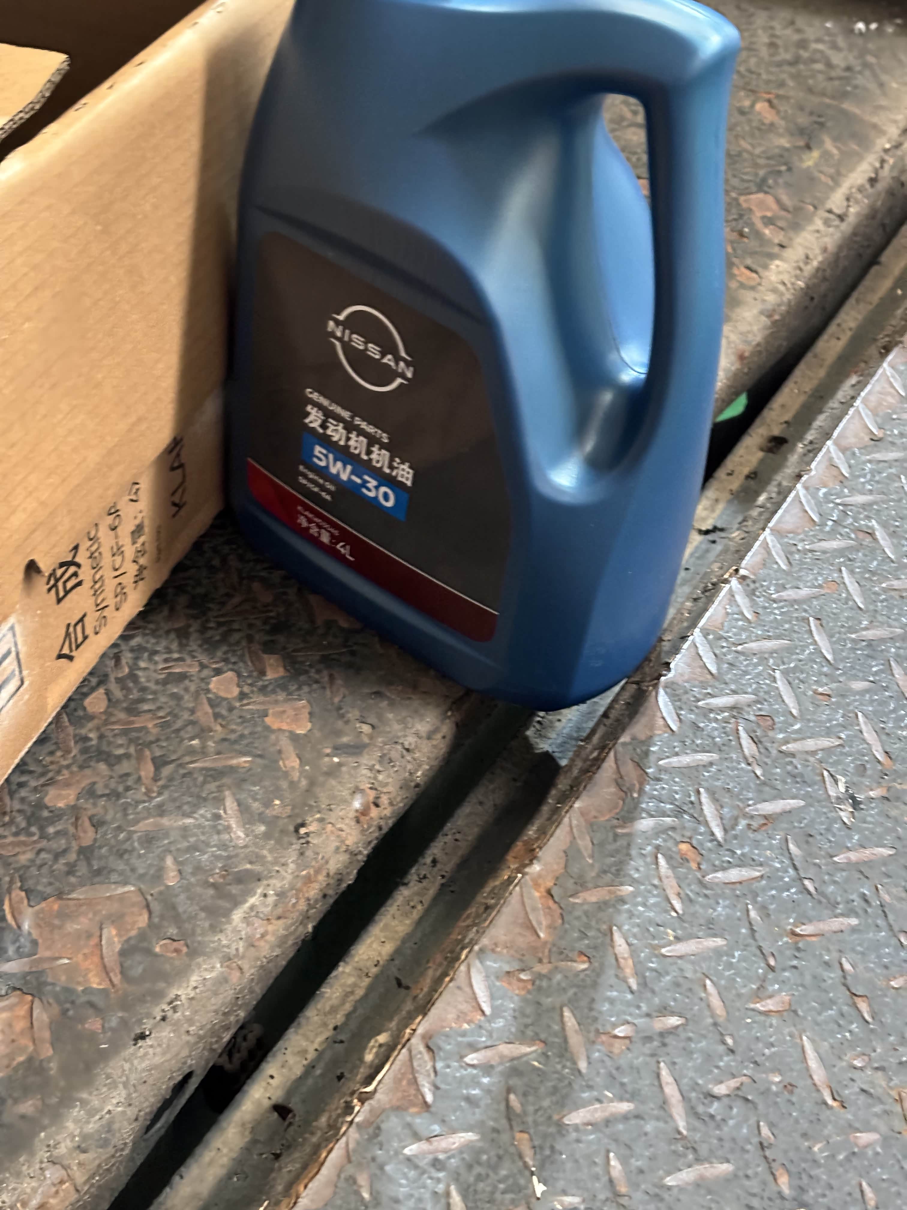 3.到了更换机油的步骤了,拆掉放油螺丝帽,换掉机油机滤,然后降回车辆,加上了日产5W-30日产机油,最后启动车辆,再次检查机油液位