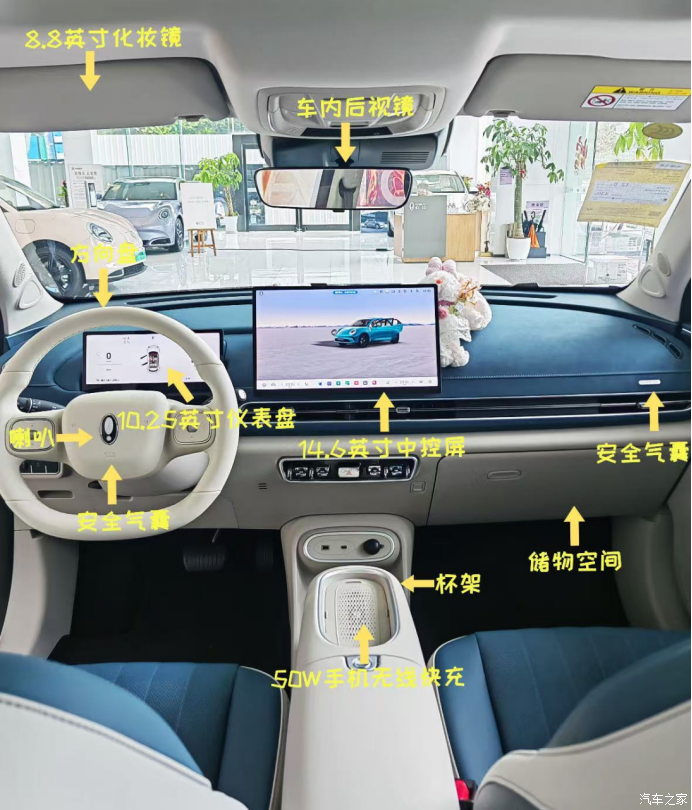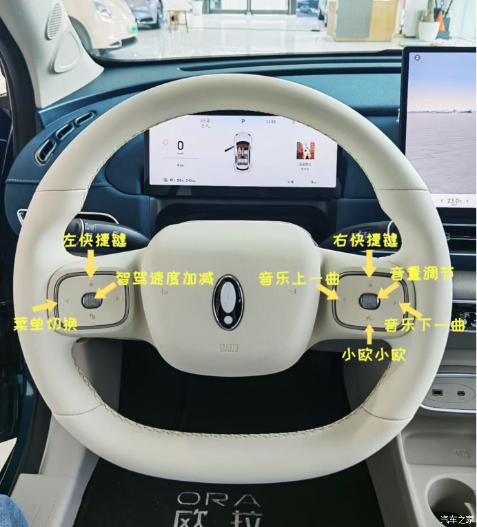 前排有的基本功能什么的我也在图里标了,大家可以看看。这次内饰变动最大的是中控屏和方向盘。从双联屏变成了大小屏,屏幕尺寸比我家里的ipad还大呢,特别是机车还更新了,能下载很多软件,比如k歌软件,听歌软件,有声读物,小游戏等,ota升级后导航的时候还能显示红灯的秒数。