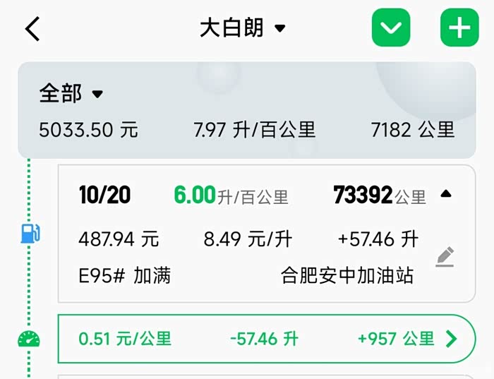 今天接娃放学,在同一加油站把油箱加满,至跳枪加了57.5升油,花费488元,共计行驶957公里,实测平均油耗6.0L/百公里。实践证明,夏朗的长途油耗还是挺低的,比我的1.6L手动朗逸高不到1升,花费多不到100元,但驾乘体验可不是100块就能弥补的,所以非常满意!