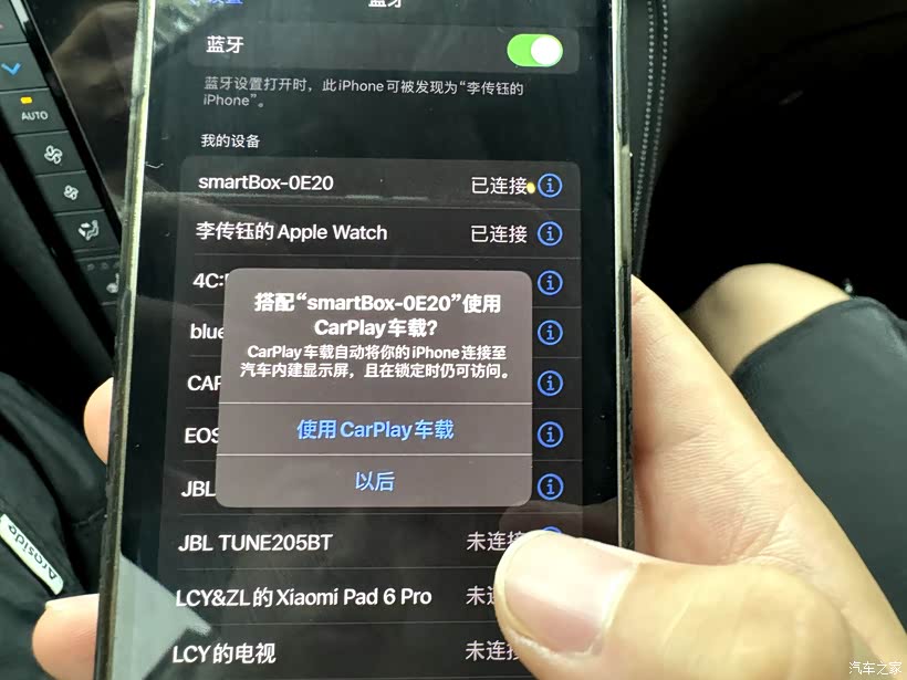 🔧打开手机蓝牙连接界面,找到车机屏幕上的那个蓝牙设备名称,然后直接配对,然后点击使用CarPlay车载。