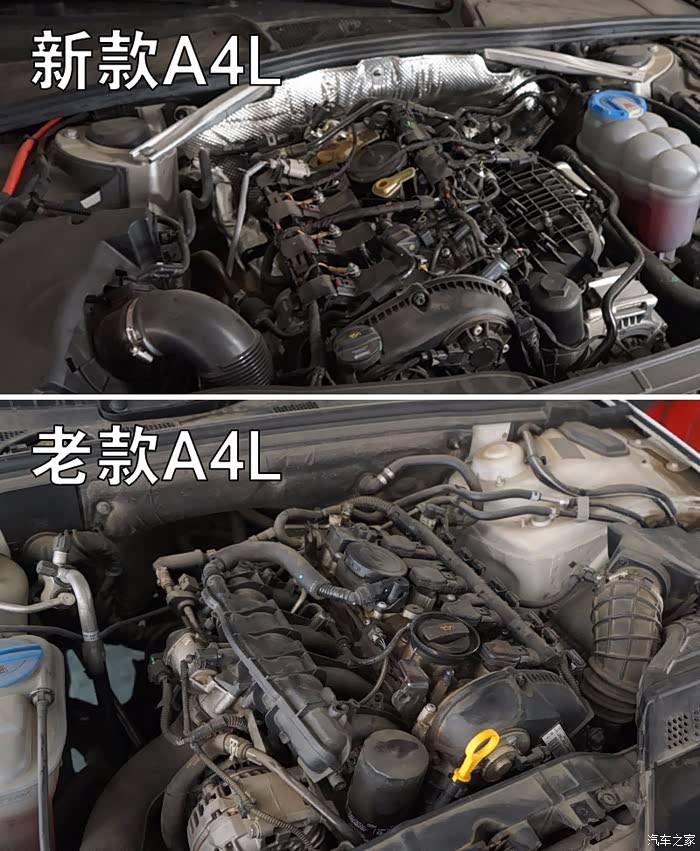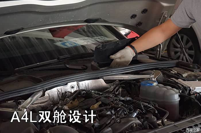 在拆前后保险杠之前,我们先看一下新老两代A4L发动机舱内的布局。无论是新A4L还是老A4L都是采用“双舱”设计,大部分的油液管线都安置在发动机后方。这样设计的优点是方便维护、隔音、隔热,还能起到比较好的防火效果。