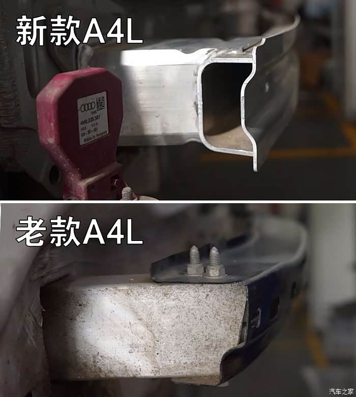 后防撞梁:老A4L铁皮,新A4L铝合金