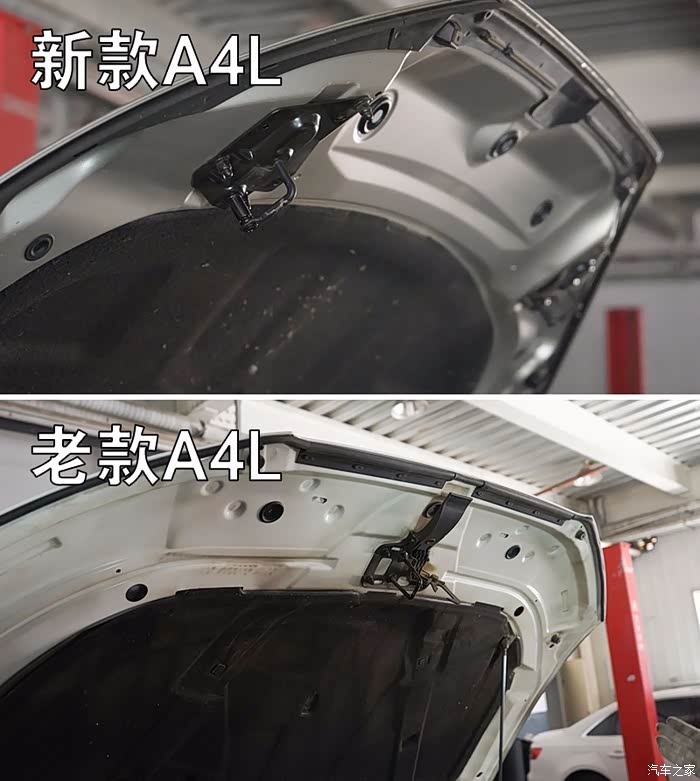 两车对比之后可以发现,新A4L发动机舱的铝箔板防火层面积非常大,而老款A4L防火层用的还是防火石棉,并且只有最下端才铺有一点铝箔板防火层。另外,新款A4L发动机舱盖配的是双液压挺杆,而老款还是撑杆方式。