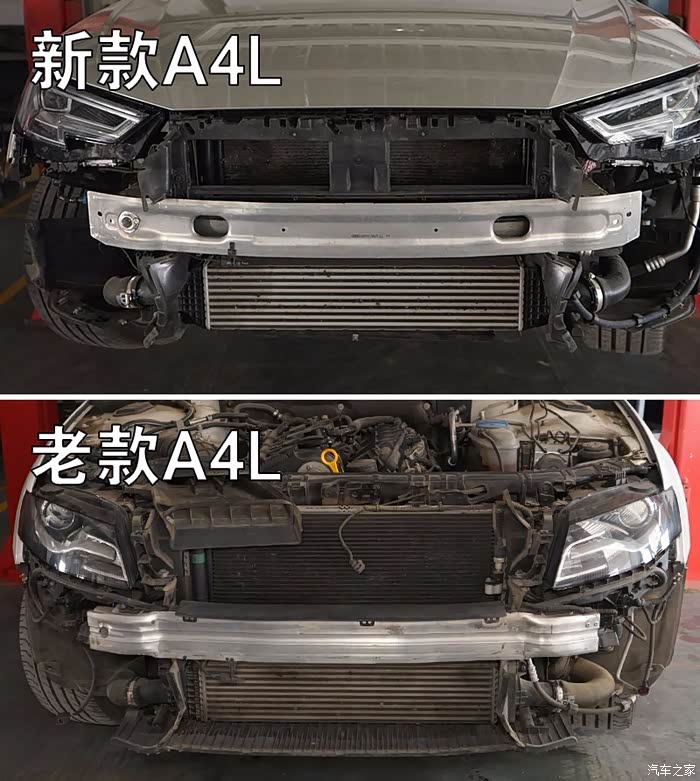 拆掉两台奥迪A4L的前保险杠,我们可以看到两台车的前防撞梁都是白花花的铝合金,看上去都很厚道。