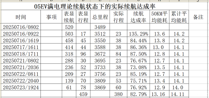 理论上跑了459公里,实际跑了380公里,续航达成率综合在80%以上,剩余里程61公里。以此类推,在有冗余的情况下,跑城郊,05EV可以达到400公里无忧。激烈驾驶,350公里没问题。但跑高速的话,估计只有300公里甚至更低。