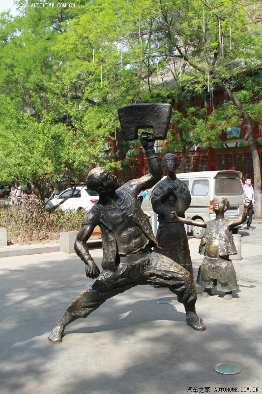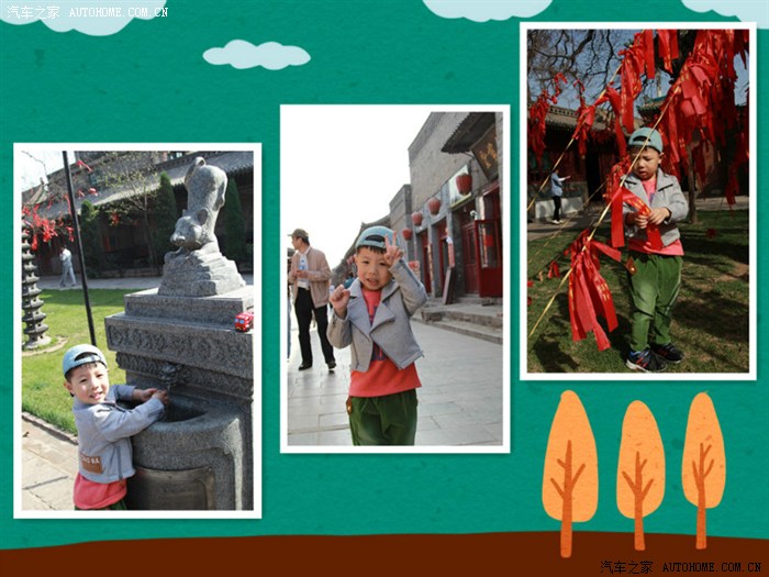 山西境内,忽而高耸的山体,忽而低洼的沟壑,往往转眼间就能看到夹杂在黄色山体中间一点白色花树或是滴翠的杨树,或是依山而建的窑洞民宅,绿的窗棂红的窗花,红砖的院墙和门口一棵盛开的紫色梧桐树。高速公路就在这些山谷的中间盘旋而建,路况非常复杂。双向四车道的路上,超长超重的大货车呼啸着奔过,美景只能这么记在心里。当终于从大队车阵中脱离出来的时候,我们都小小的松了口气。其实对于小指的能力我还是比较放心。儿子在这时候终是出现了状况。中午的贪嘴再加上盘旋的山路晕车了,狂吐。好在吐过之后胃里空虚状态变好许多。我和儿子合作着拍了这张照片,记录下这段路程的景色和地貌,也给他留个纪念。到这里,我想对各位想带孩子外出游玩的自驾家长们说:路上不论您还是孩子,不要在车上吃得太饱。给胃留一点点空间!~