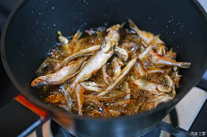 现在开始来炸小鱼干。跟你们说哈最好选择这种小口深一些的锅子,这样省油哦小火慢慢炸。