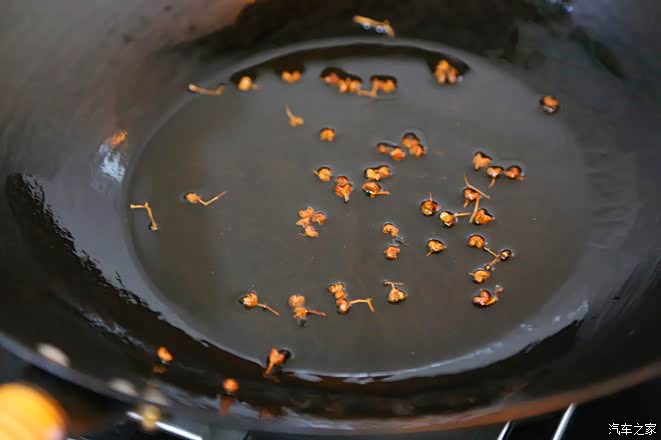 锅里少许油,加入一些花椒粒儿小火慢慢爆香,喜欢麻辣的可以放多一点点。