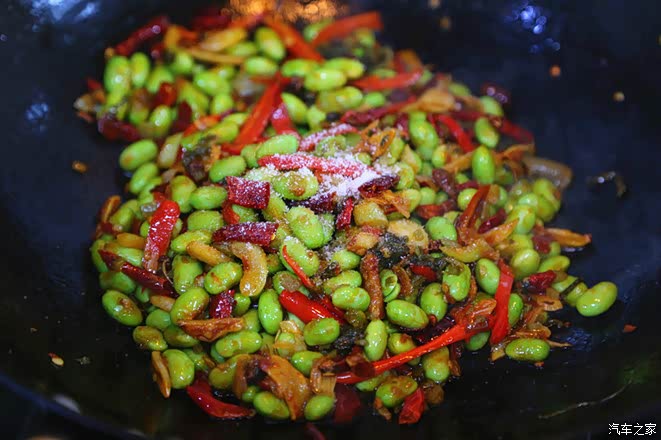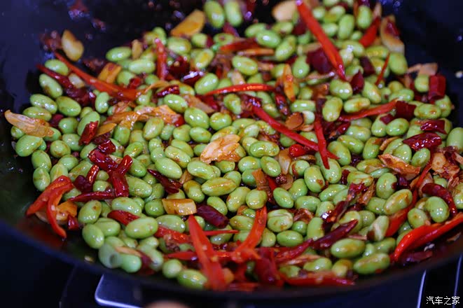 煮好沥干水的毛豆米丢进去转大火翻炒。