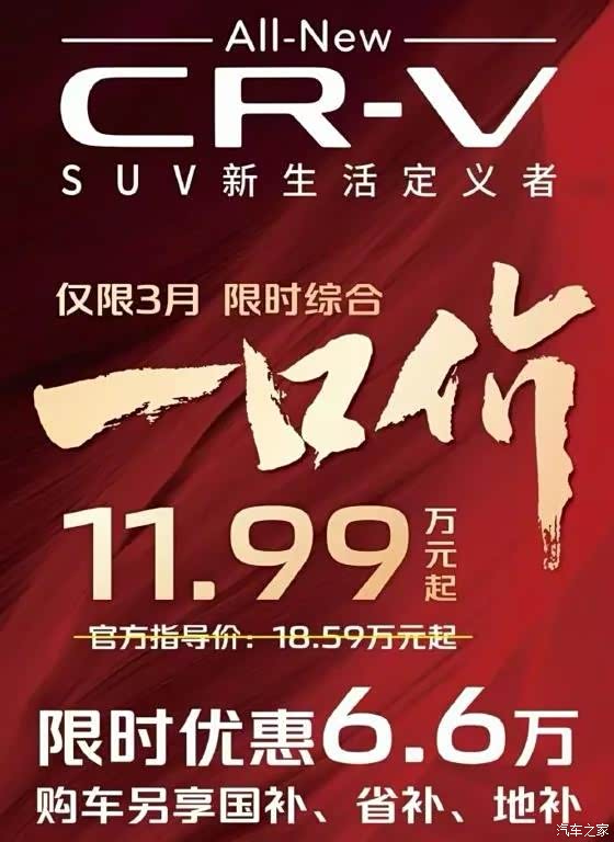 实际上到店的话销售会告诉你现在买全款买优惠4万也就是14万多,那也不是海报上的一口价啊!这一口价需要分期加上置换,分期才能减免两万,置换的话最高置换1万多块钱,有报废车在这个基础上还能再优惠可能连11万都不到,CR-V在2月份销量暴涨3.4万辆,没有不能买的油车,只是价格还没到位。本田CR-V的质量还是不错的,家用动力能跟得上。