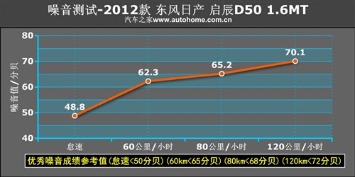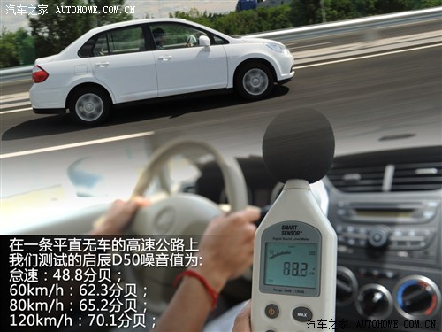 对于噪音的控制,启辰D50做的也相当不错,发动机在超过3000转之后,发动机噪音仍能够让人满意。风噪和胎噪在高速时会略微增加,但是总体上表现让人满意。在一条平直无车的高速公路上,我们测试启辰D50噪音值为:怠速48.8分贝;60km/h:62.3分贝;80km/h:65.2分贝;120km/h:70.1分贝。
