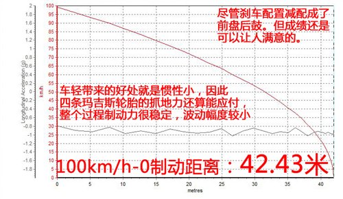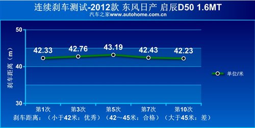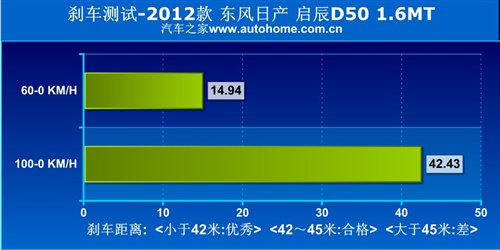 尽管启辰D50的刹车简配为前盘后鼓,但是在测试场上它却没有丝毫的怯场,鼓刹的制动力自然没有问题,而且多次测试成绩也相当稳定,应该说应付起这1.1吨的车身,前盘后鼓已经完全够用,42.43米的成绩没有亮点,但也达到合格的标准,对得起它的身价。话说回来,尽管阉割为前盘后鼓的刹车让人看着不太舒服,但是如果不是经常跑山路的话,这个减配对于日常使用的影响其实并不大。