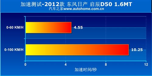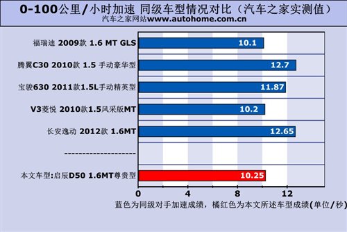 最终,启辰D50的加速测试没有让我们失望,车轻,窄胎和高转发动机都是它取得好成绩的关键,10.25秒的百公里加速时间,在所有我们测试过的1.5/1.6L(不包括1.6T)紧凑型车中排名第三,排在它前面则是福瑞迪1.6MT的10.1秒和V3菱悦风采版MT的10.2秒。