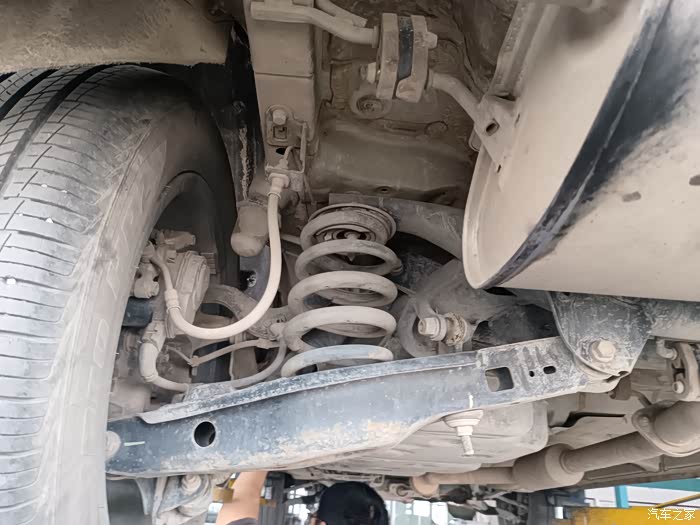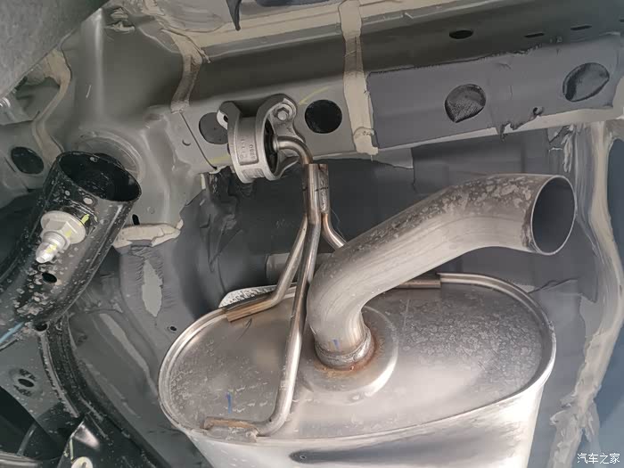 丁师傅把上面的管子揪下来用压缩气枪吹了好一阵子,说如果还这样就是碳罐需要更换了。如果碳罐损坏时有可能大气压把油箱压瘪,听着还挺害怕。一通下来吹了好一会,丁师傅还挺认真!难得趁此机会拍了这辆车的几张车底照,恰巧与我的四代对比一下。