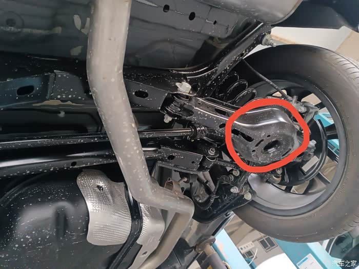 其实我还有个担心,事情是这样的:新车买后不久车后侧右面就扎胎了,补胎的师傅把千斤顶顶在了车的右下摆臂处,记得随车说明书说千斤顶要顶在车轮附近的车帮下面。所以总是担心他给我顶坏了下摆臂。还好这次重点看了一下没事。