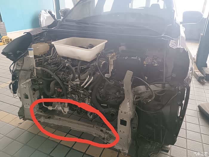水箱下面无横向钢板,直接是塑料的!如果前方发生碰撞真的好担心!巧得很正好旁边有一台因碰撞待维修的cs75。前脸撞得很严重,但还好他的水箱处正好有横向的钢板连接,所以保护的很到位。发动机应该没有大问题,但真要是我这款四代发生这样的碰撞可就危险了!真是不怕不识货就怕货比货!上图对比,非常明显!